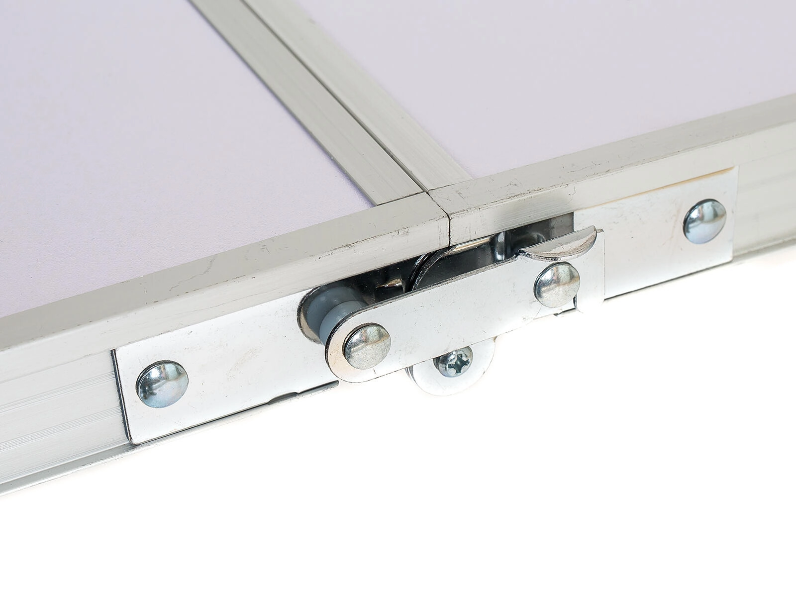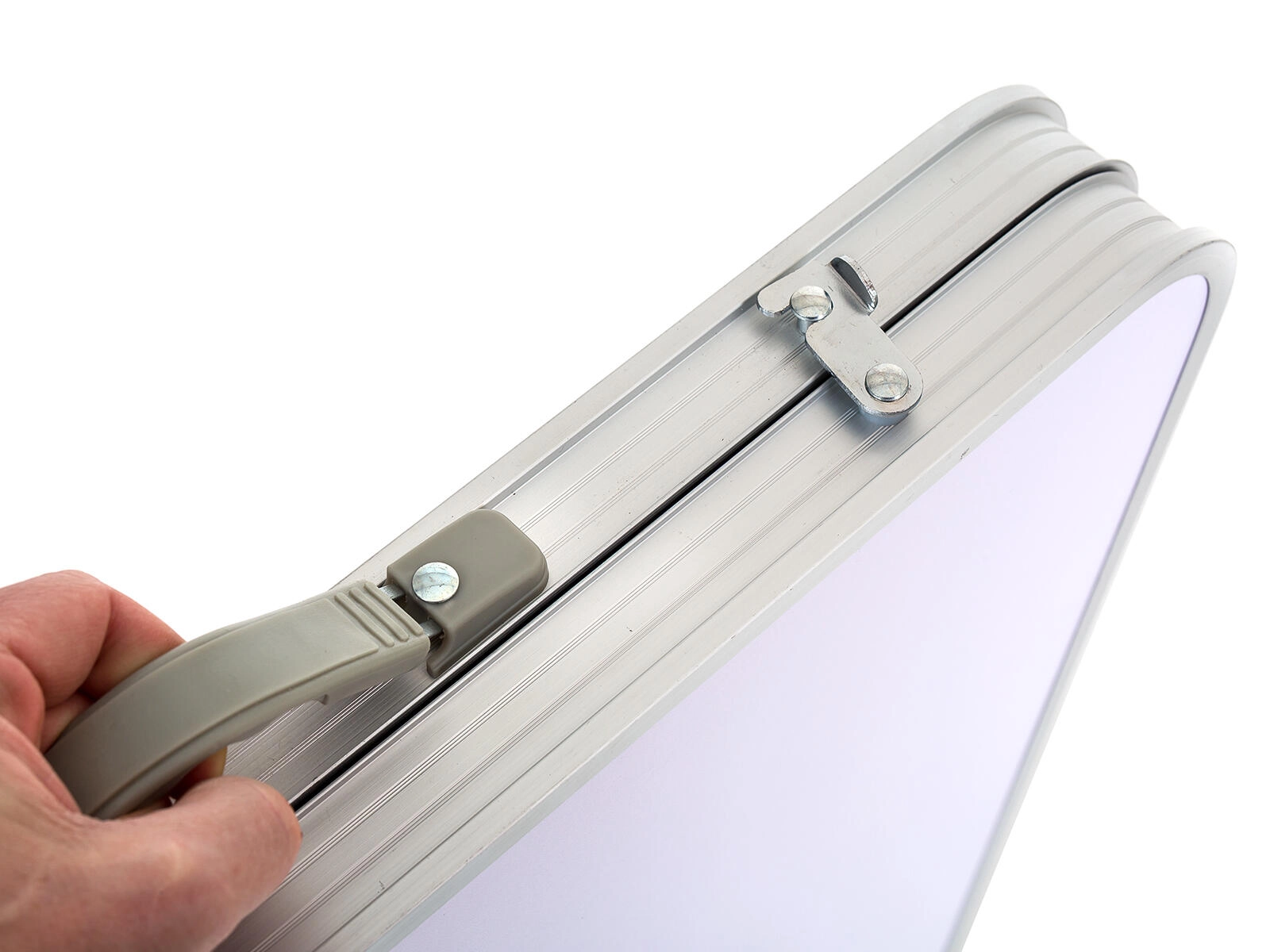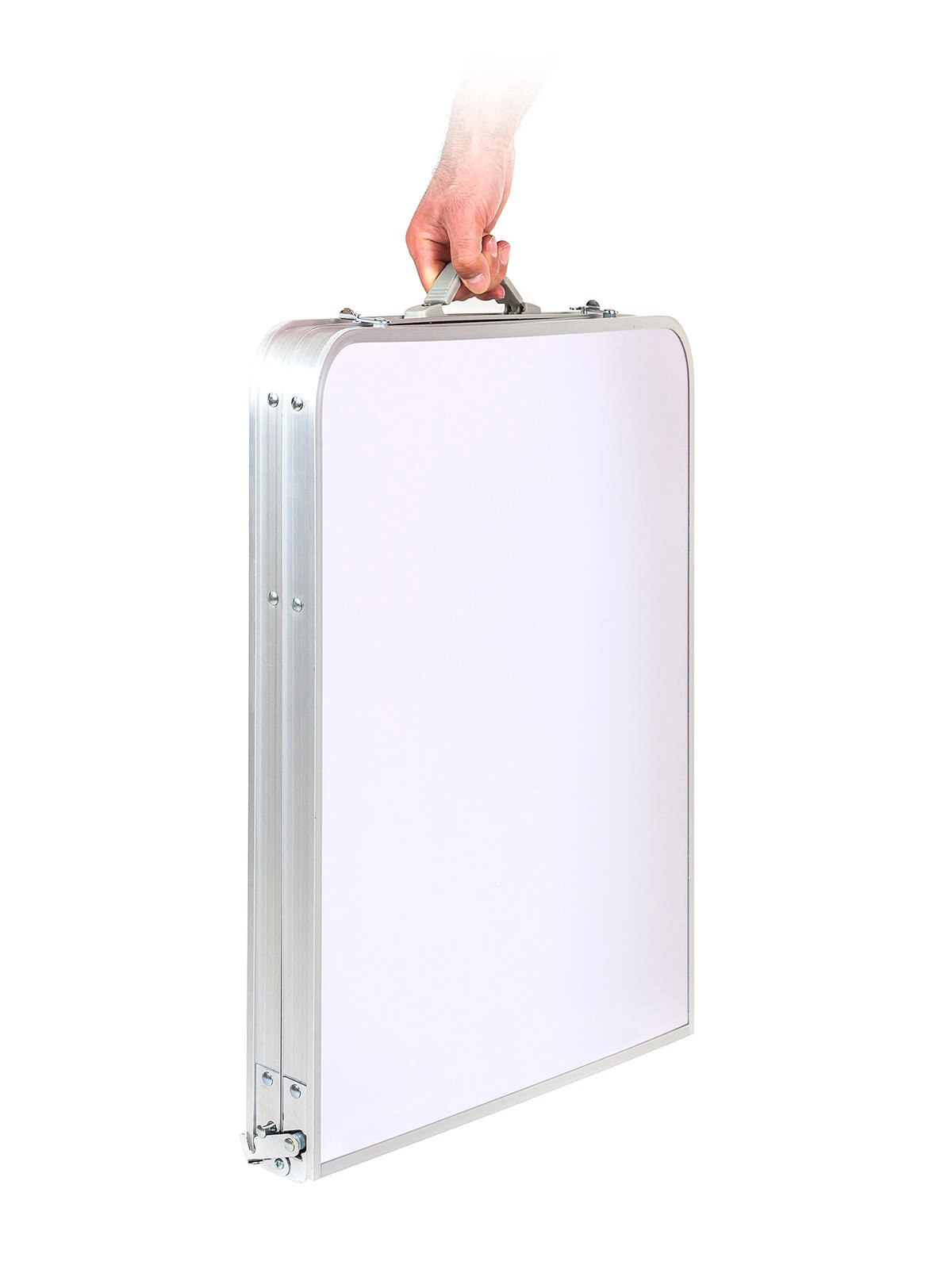 Tout l’ensemble se plie facilement dans une valisette plate avec poignée intégrée pour un transport aisé et un rangement peu encombrant dans la voiture comme à la maison.