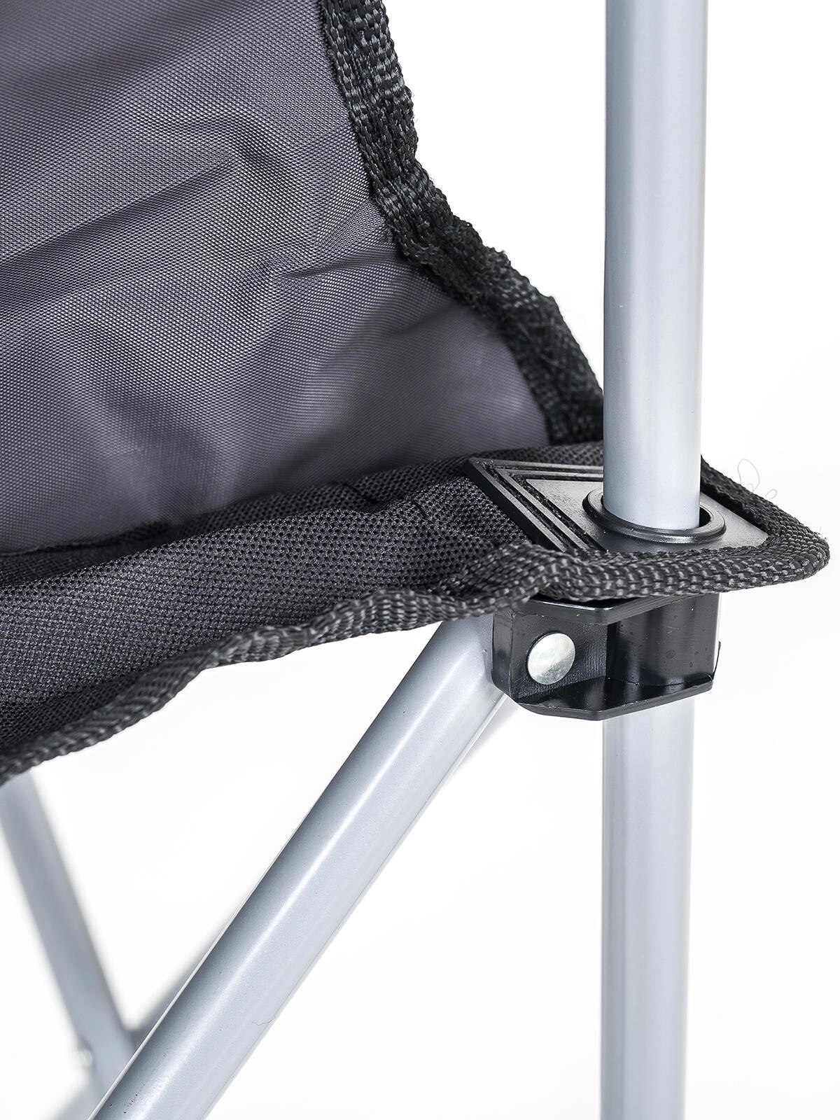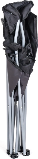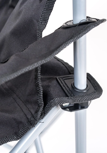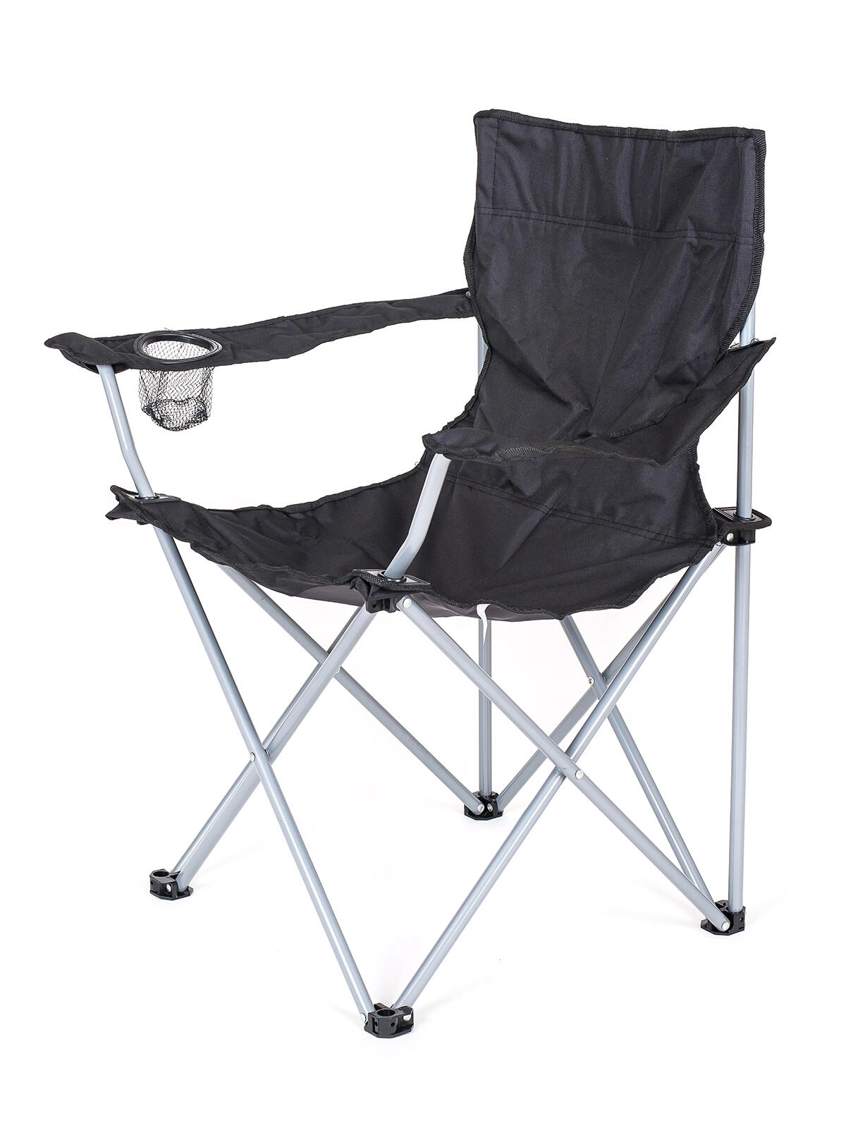 Le fauteuil possède des accoudoirs confortables, dont l’un est équipé d’un porte-gobelet intégré. Grâce à ses dimensions compactes une fois plié, il se glisse facilement dans la housse de transport fournie et ne prend pas de place dans la voiture ni au garage.