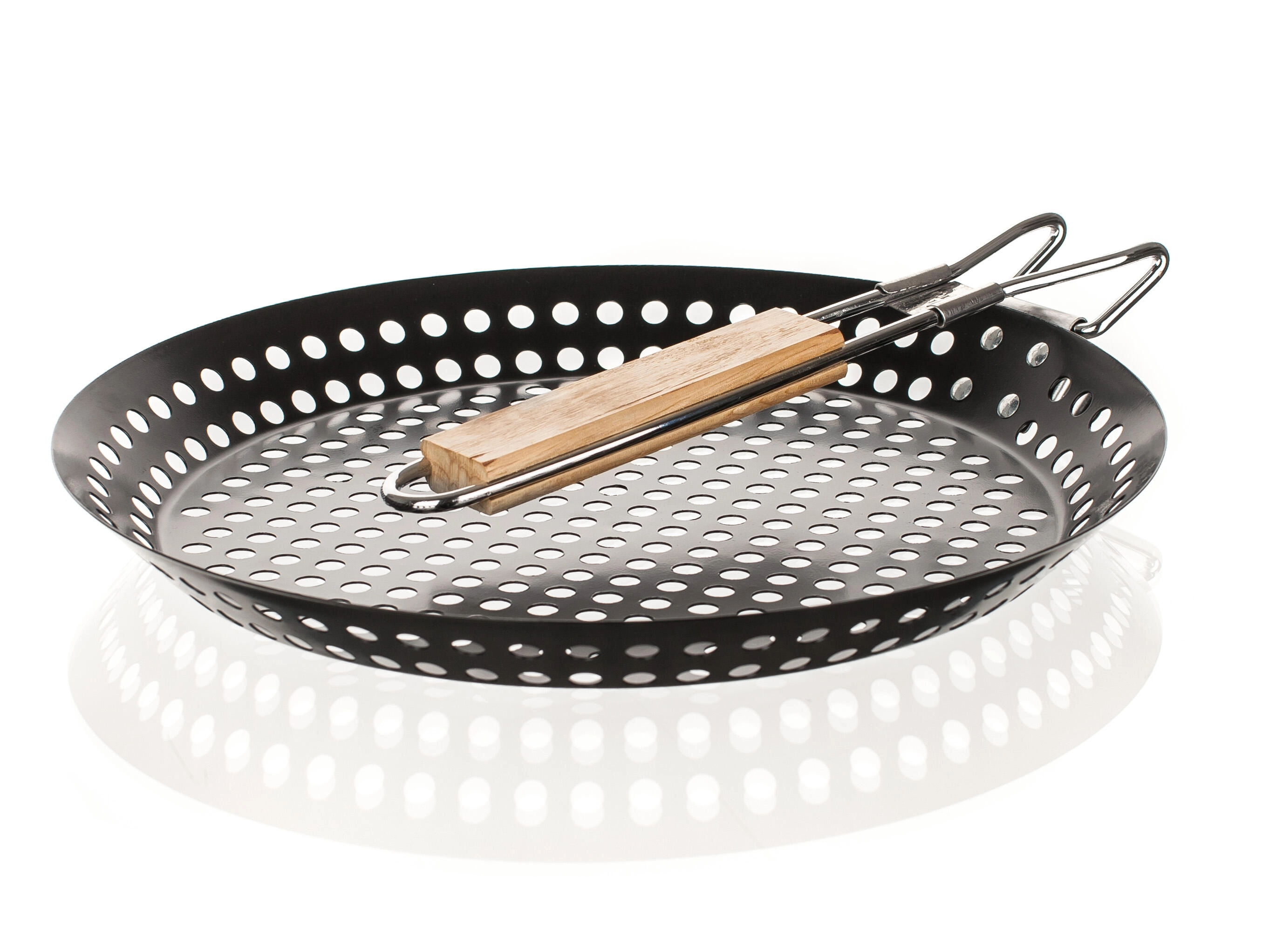 Cette poêle ronde pour grill associe acier résistant et revêtement antiadhésif pour retourner et servir facilement sans accrocher. La perforation permet une parfaite circulation de la chaleur et de la fumée, donnant aux aliments un arôme typique de grill et une cuisson homogène.