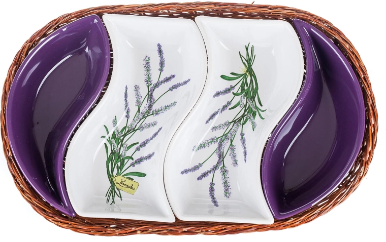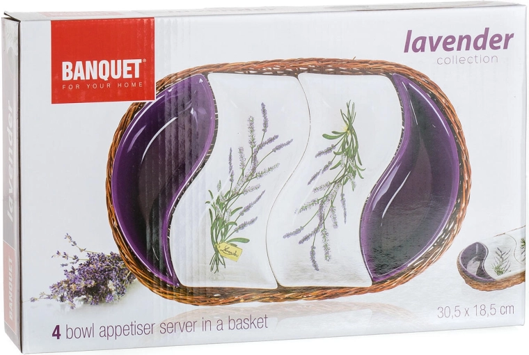 L’ensemble de bols LAVENDER apporte une harmonie de couleurs et de matières naturelles à votre table. Deux bols au motif lavande délicat et deux bols en céramique violette composent une présentation raffinée pour encas, salades, dips ou desserts. Le panier en osier maintient le tout réuni, facilite le transport et confère au set un style rustique.