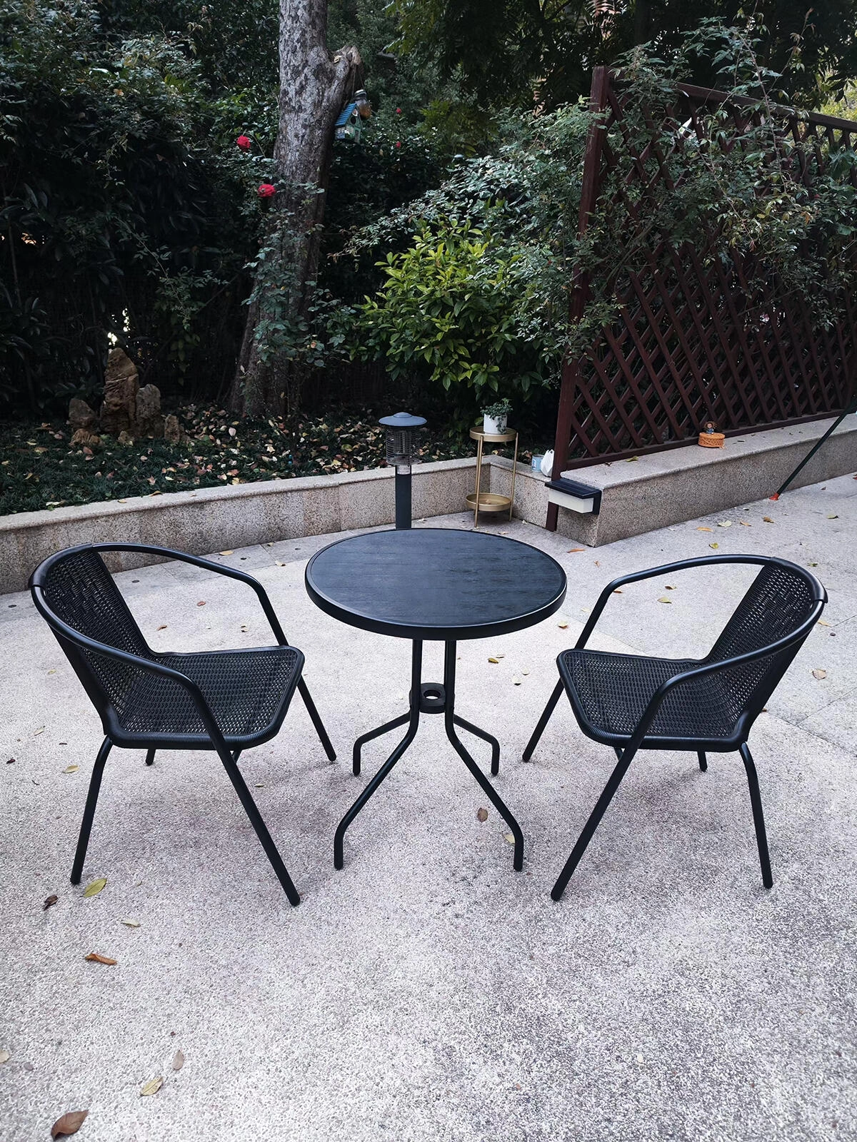 Ce set de mobilier de jardin noir élégant est conçu pour s’asseoir confortablement à deux et s’intègre parfaitement aux petits comme aux grands espaces extérieurs. Les chaises à l’aspect rotin en PH et le cadre métallique stable assurent une longue durée de vie et un entretien aisé, tandis que la table ronde compacte est idéale pour les boissons et les petites collations.