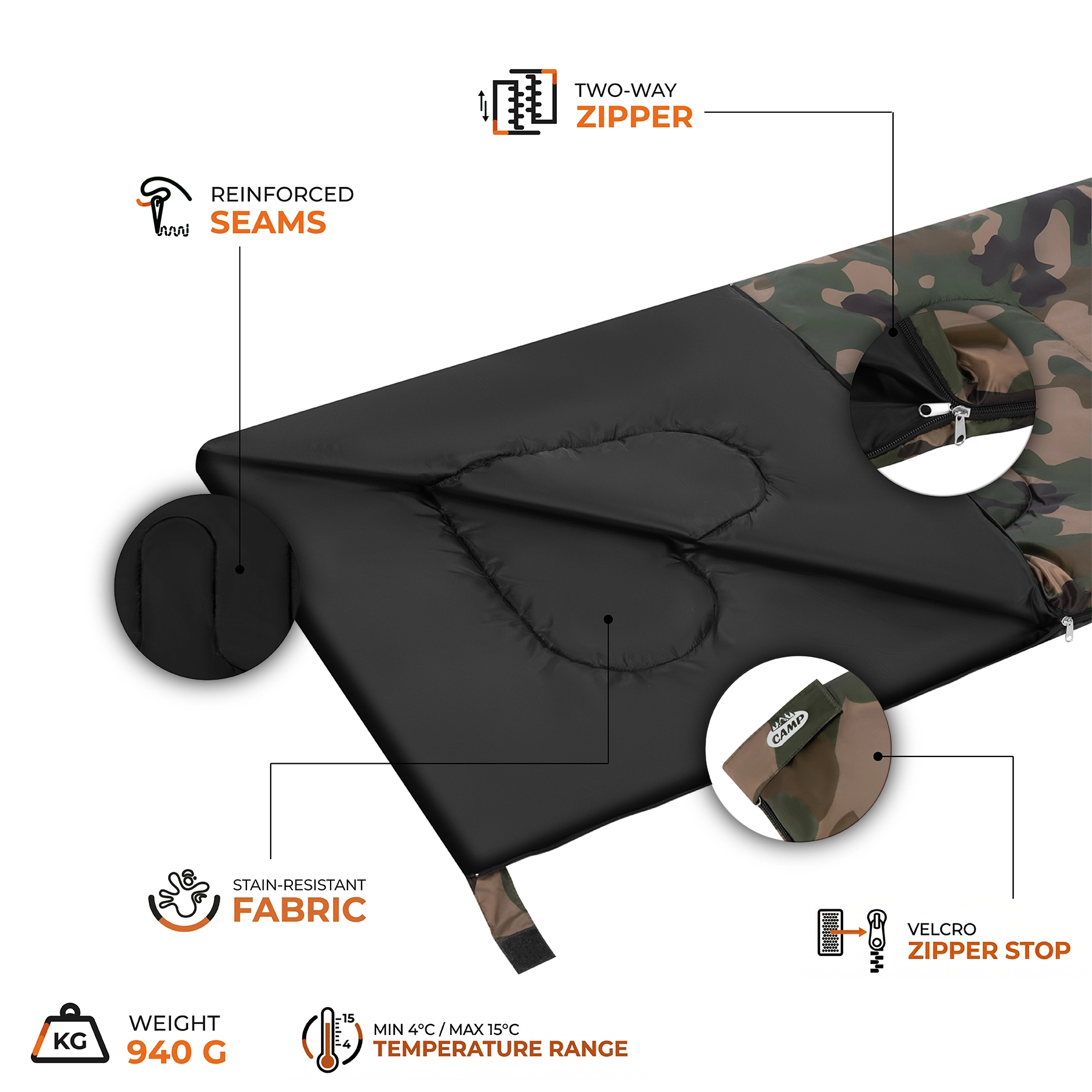 Léger et confortable, le sac de couchage couverture NILS Camp au design camo est idéal pour le camping, le bivouac et les nuits à la belle étoile. Grâce à des matériaux de qualité, il offre une isolation thermique fiable, la possibilité de l’ouvrir complètement en couverture et de jumeler deux sacs en un. La fermeture éclair à double sens, dotée d’un large rabat avec velcro, garantit une fermeture sûre sans ouverture involontaire.
