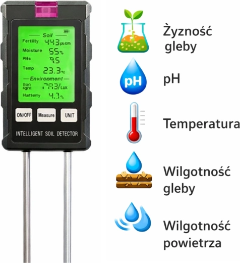 - Utilisation aisée : insérez les sondes dans le sol, appuyez sur Measure et évaluez les conditions.