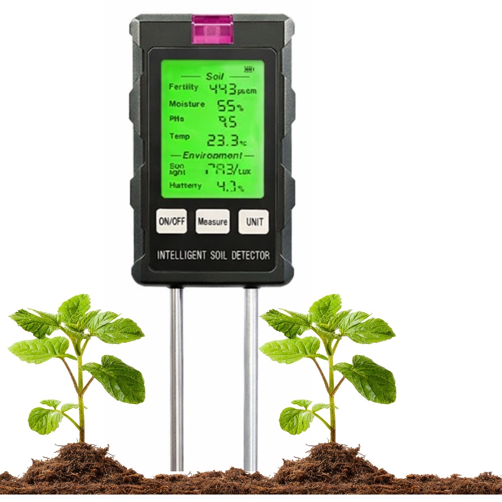 Le mesureur de sol intelligent 6-en-1 vous donne un contrôle total sur la culture. Sur un seul écran rétroéclairé, il suit l’humidité du sol, le pH, la température, l’intensité lumineuse, la fertilité/nutriments et l’humidité de l’air. Grâce à une sonde double sensible, il mesure rapidement et avec précision, et le changement d’unités de température facilite l’utilisation à la maison, au jardin et en serre.