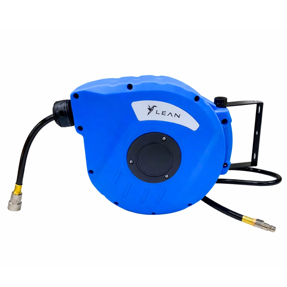 Enrouleur pratique avec tuyau pneumatique de 10 m pour atelier et garage. Grâce à l’enroulement automatique, il maintient l’ordre ; le tuyau flexible en PVC résiste aux usages intensifs et les raccords rapides 1/4" BSPT assurent une connexion rapide. Support mural pour un montage sûr et un travail confortable.