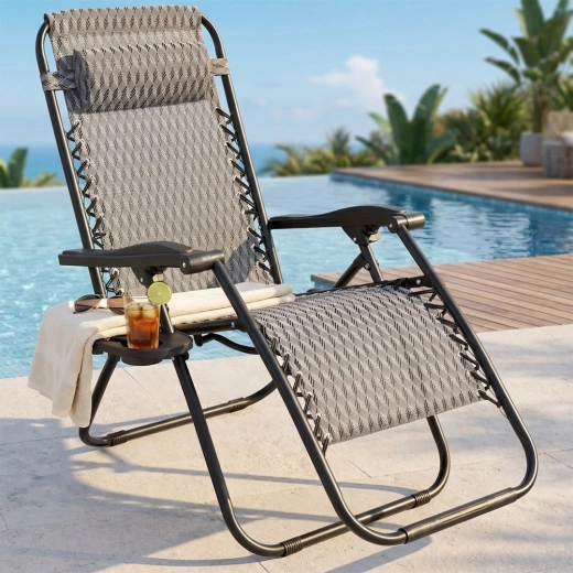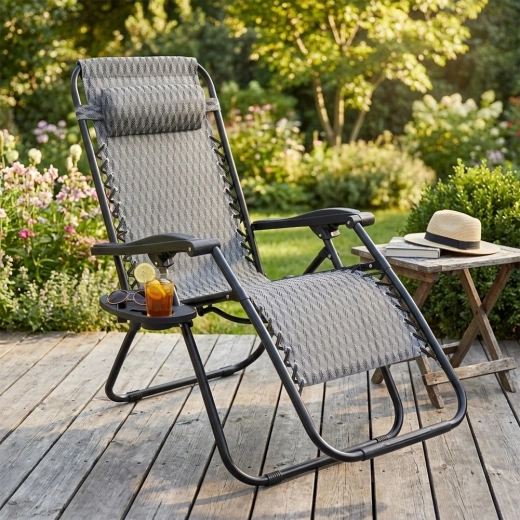 Profitez d’un repos parfait sur une chaise longue gravitationnelle confortable avec réglage fluide de la position. Grâce à sa conception ergonomique, la chaise longue s’adapte à la morphologie, soulage le dos et la colonne vertébrale et offre les positions assise, semi-allongée et allongée. Un cadre métallique résistant, une toile grise respirante à motif, un coussin d’appui-tête amovible et une tablette latérale avec porte-boisson en font un choix idéal pour le jardin, la terrasse, le balcon et le camping.