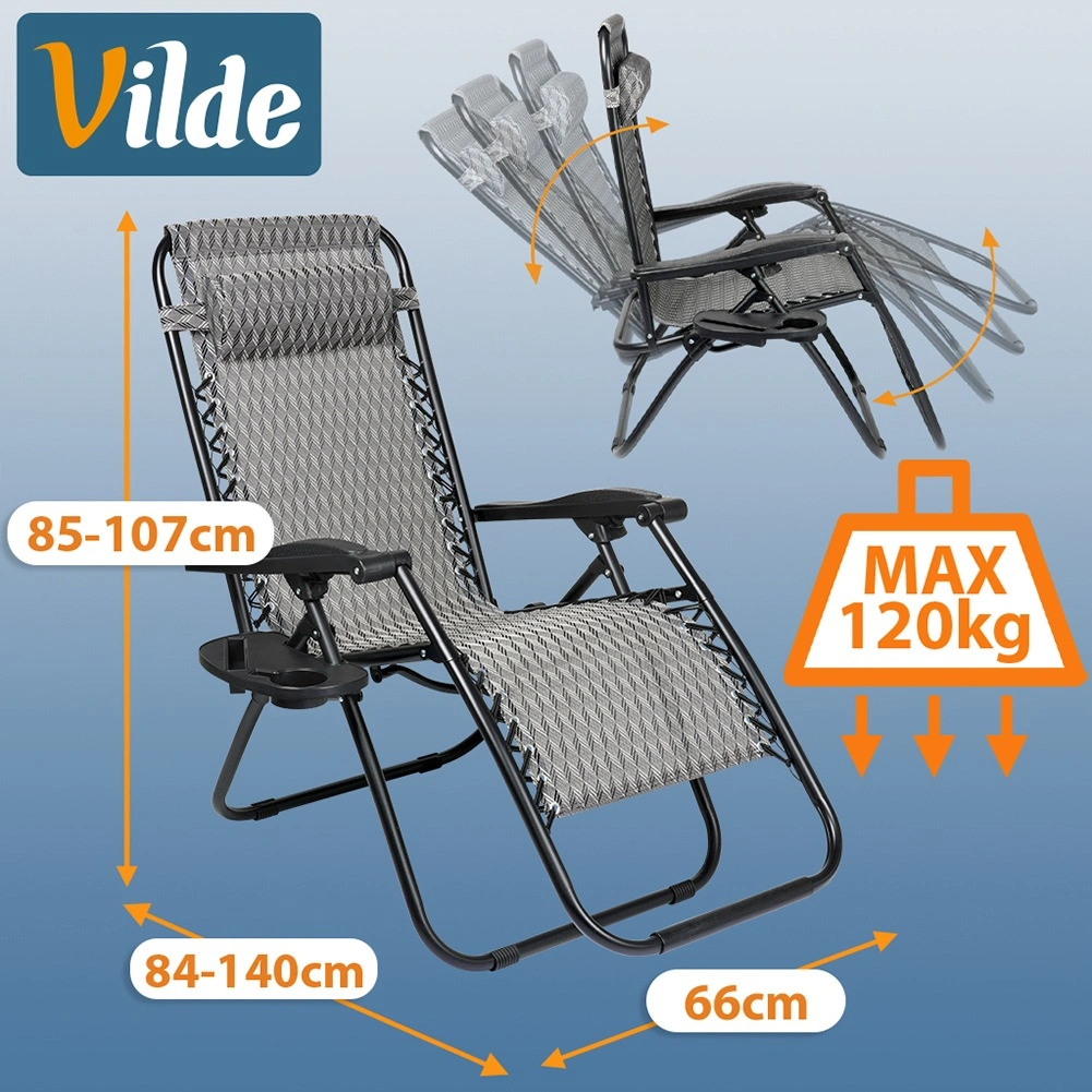Le réglage gravitationnel permet de changer facilement la position du corps pour un confort maximal lors de la lecture, du bain de soleil ou de la détente. Sa structure métallique stable supporte jusqu’à 120 kg et la toile en polyester robuste de couleur grise à motif géométrique garantit une longue durabilité, même en extérieur.