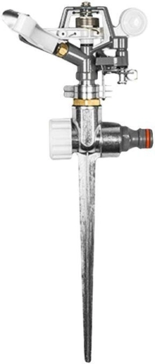 Arroseur à impulsion fiable sur pique métallique de la gamme WHITE LINE pour un arrosage confortable des grandes surfaces. Il offre un réglage du débit d’eau, de la direction et de la portée avec une couverture jusqu’à 539 m² et un diamètre d’arrosage de 26,2 m.