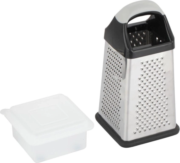 Râpe de cuisine pratique en acier inoxydable avec poignée en plastique confortable et récipient collecteur pour récupérer facilement les ingrédients. Elle offre quatre faces de râpage pour différentes préparations, une prise en main stable et un travail propre sans désordre.