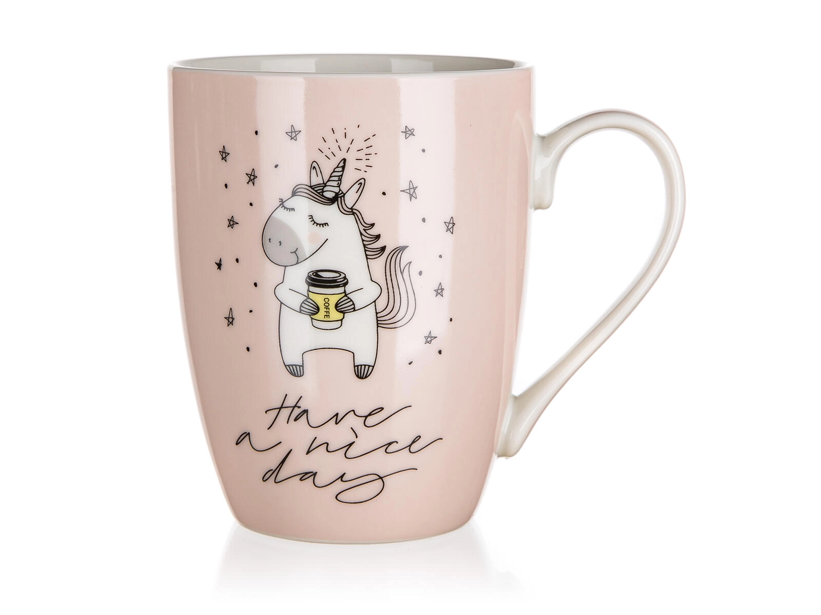Le mug est disponible en deux designs – avec les inscriptions « I believe in unicorns » et « Have a nice day ». Diamètre supérieur env. 8 cm, diamètre inférieur env. 5,5 cm. Grâce à l’entretien facile au lave-vaisselle et au passage au micro-ondes, c’est un accessoire pratique pour toute cuisine.