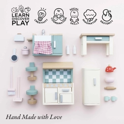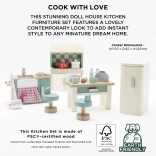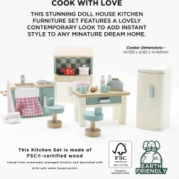 Une cuisine parfaite pour maison de poupées de Le Toy Van. Cet ensemble en bois magnifique comprend tout ce dont vous avez besoin pour une aventure culinaire miniature - évier, cuisinière, four, réfrigérateur et table avec chaises. Tout est fabriqué à la main à partir de matériaux durables.