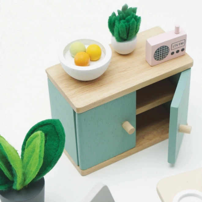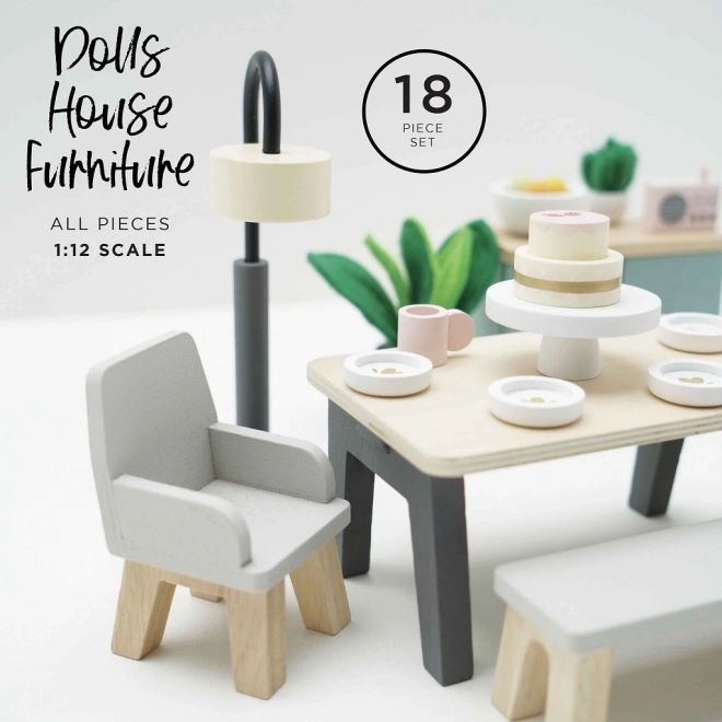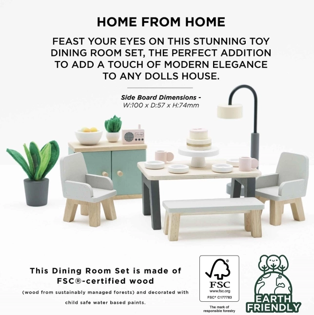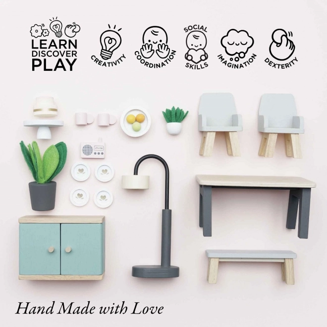 Ensemble de salle à manger en bois parfait pour maison de poupée, qui allie élégance moderne et design durable de la marque Le Toy Van. Idéal pour développer l'imagination des enfants.