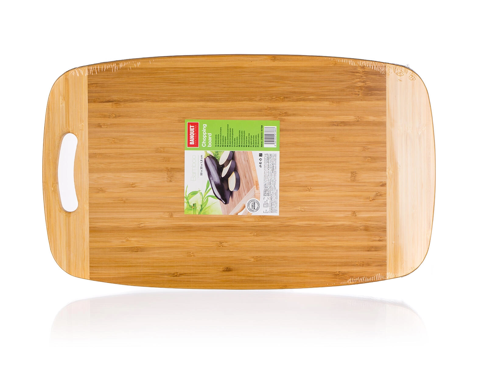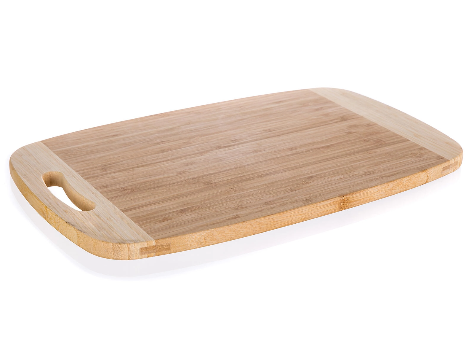 Planche à découper en bambou BRILLANTE pratique et résistante, dimensions 50 × 30 × 1,8 cm, pour une découpe confortable de la viande, des légumes et du pain. Grâce à sa grande surface de travail, elle facilite le portionnement de pièces plus volumineuses, dispose d’une poignée/ouverture intégrée pour l’accrochage et d’une surface en bambou solide et douce pour les lames, dans une élégante finition bicolore.