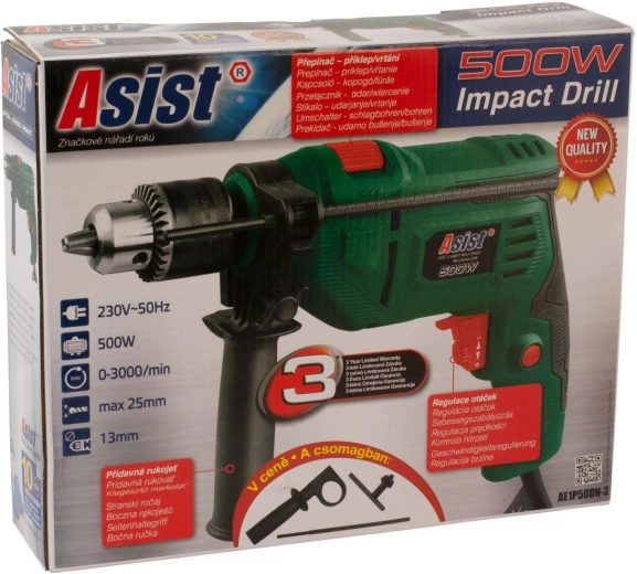 La perceuse à percussion ASIST d’une puissance de 500 W est un outil polyvalent qui facilite le perçage et le vissage dans une large gamme de matériaux – du bois et du métal jusqu’au béton et aux briques. Grâce à sa conception compacte et à la poignée auxiliaire, elle tient parfaitement en main et apporte de l’assurance même pour les travaux plus exigeants.