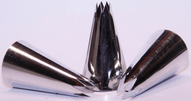 Les douilles sont fabriquées en tôle étamée résistante, garantissant une longue durée de vie et une bonne stabilité de forme. Elles peuvent être utilisées avec des poches à douille en coton standard et, grâce à leur large ouverture, conviennent aux crèmes et garnitures plus épaisses.