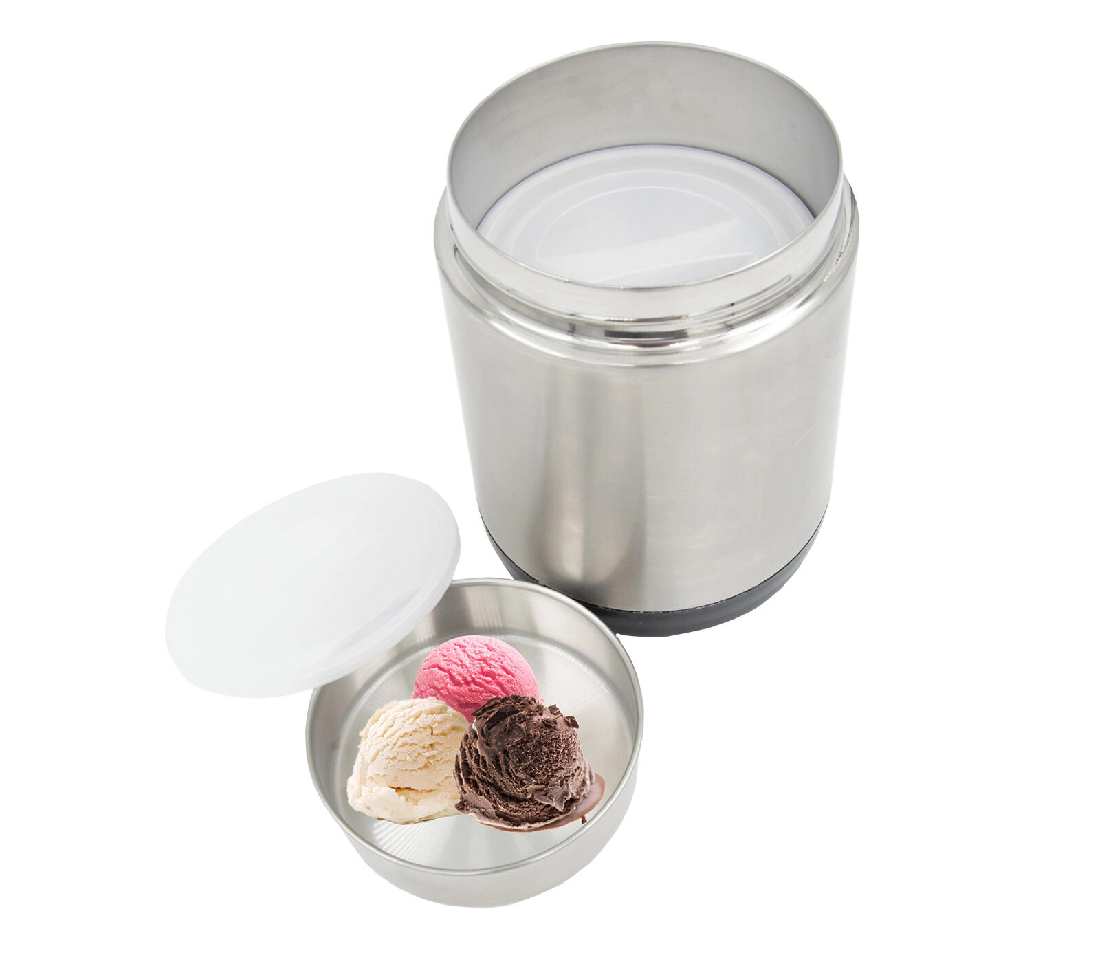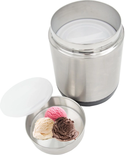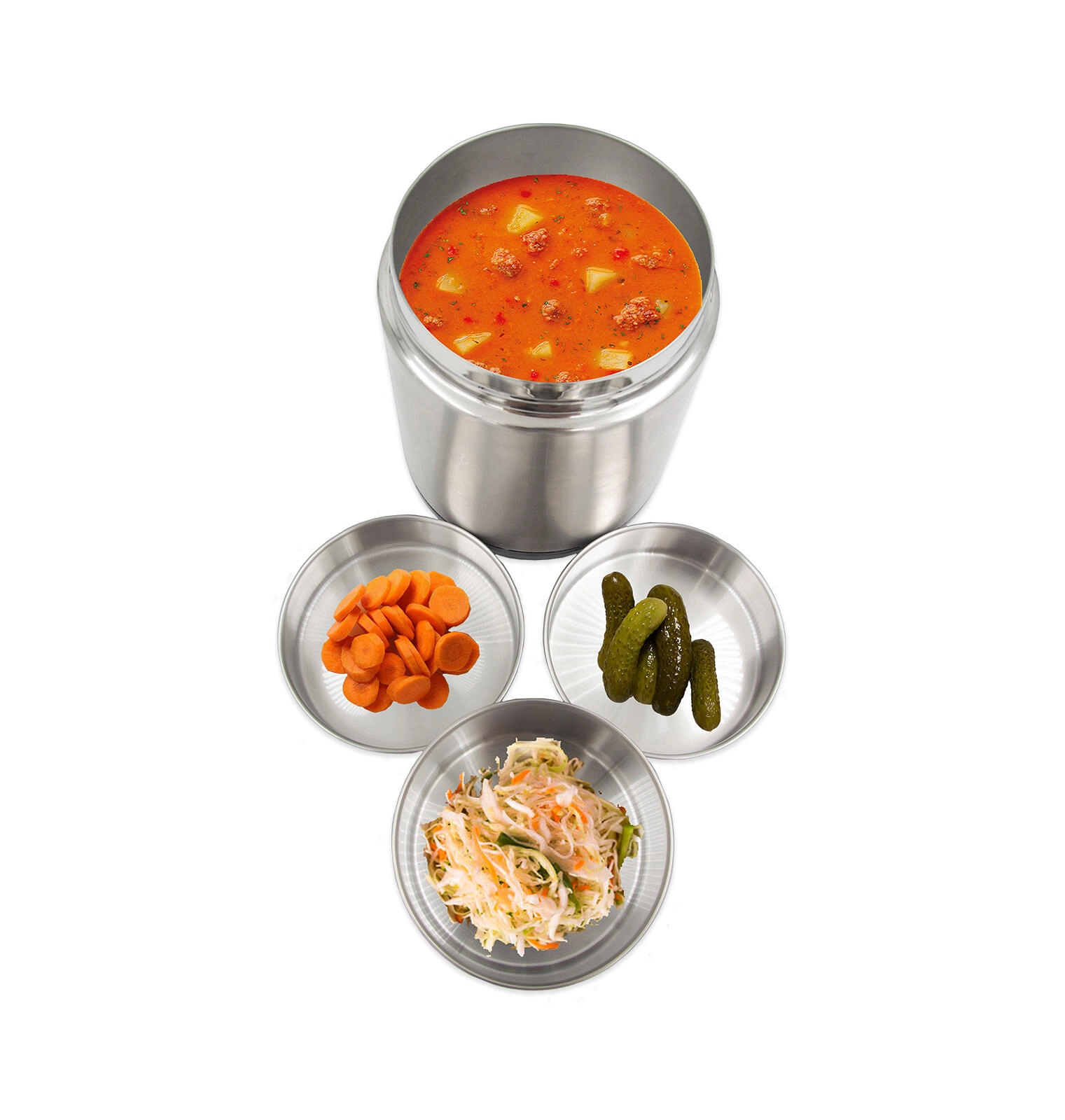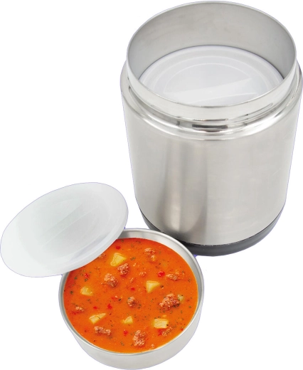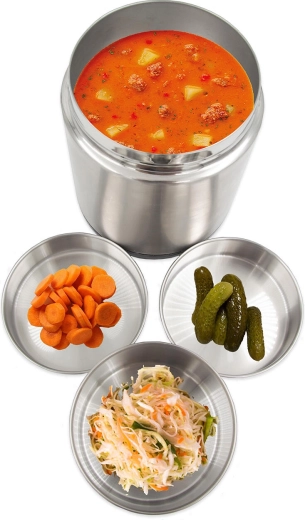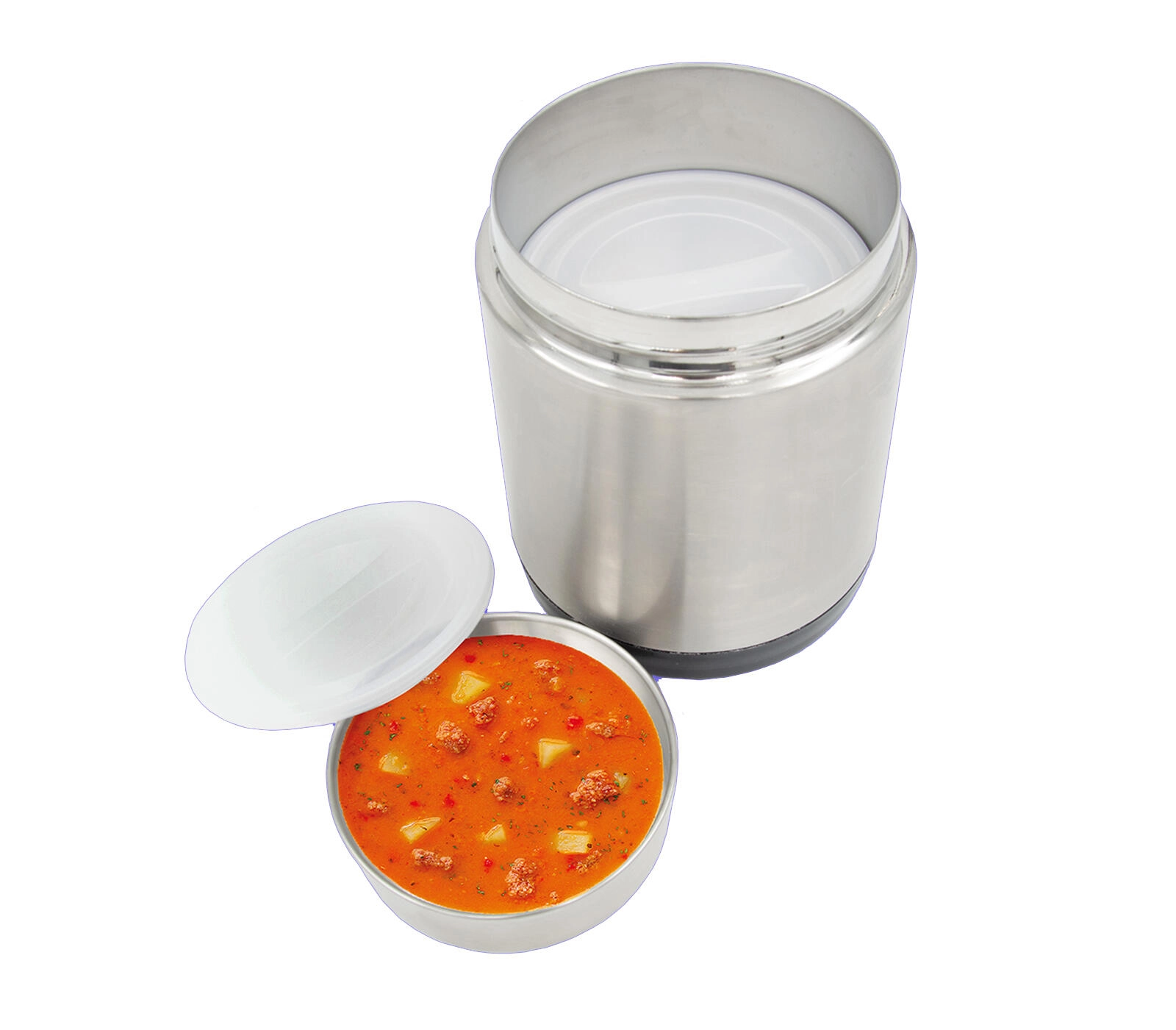 Une fois les bols retirés, le récipient peut être utilisé comme grand porte-repas pour des soupes, risottos ou sauces. Le large goulot facilite le remplissage et le nettoyage, et l’inox de qualité garantit une longue durée de vie. Parfait pour une utilisation quotidienne au travail, en voyage, pendant le sport et pour les personnes qui ne mangent pas au restaurant. Le récipient isotherme convient également aux desserts froids, par exemple la glace.