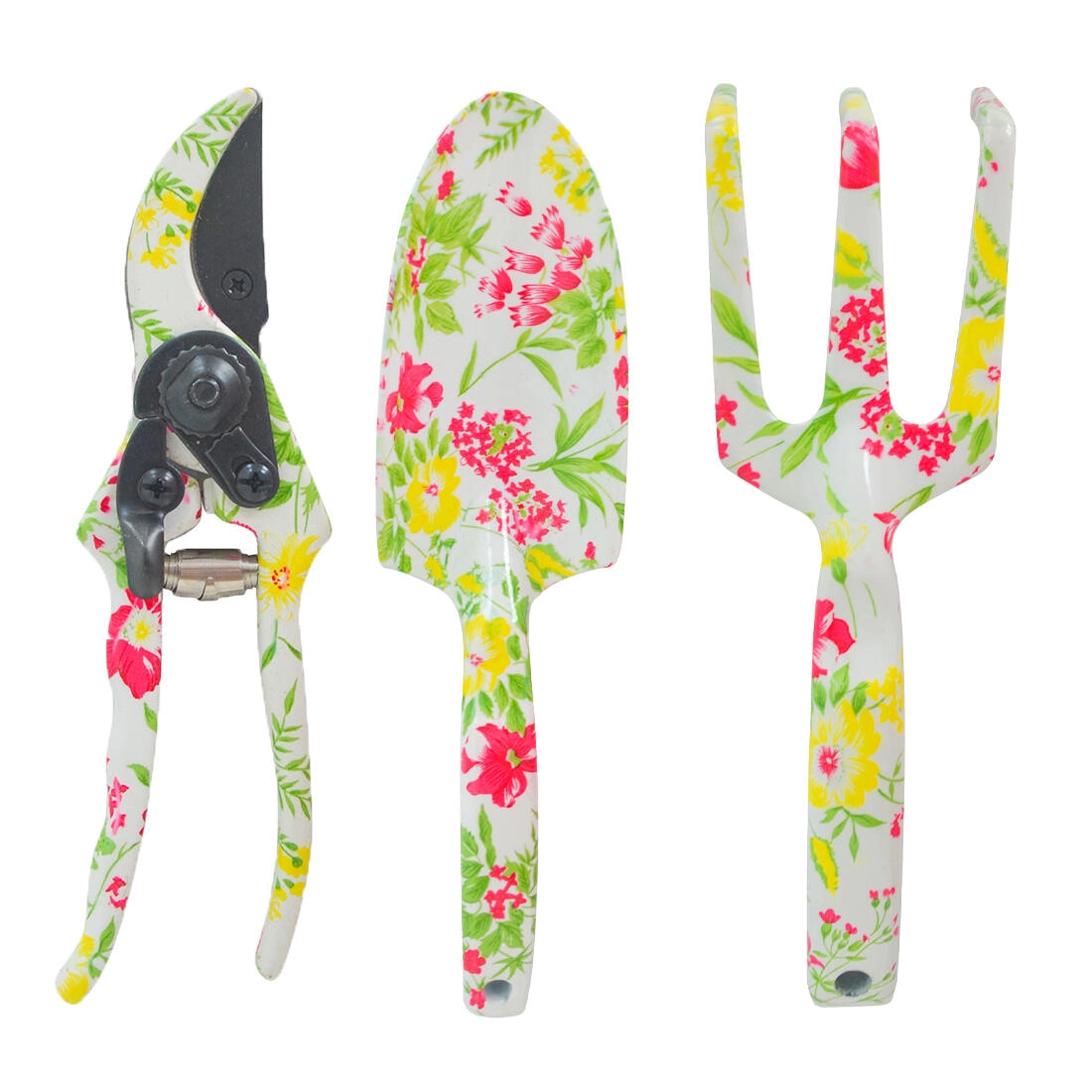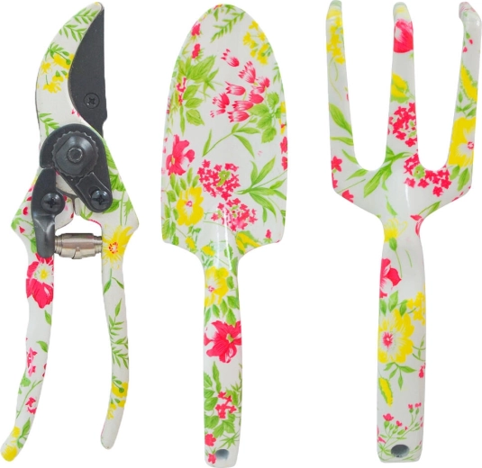 Élégant ensemble de 3 outils de jardinage manuel de couleur blanche avec décor de fleurs roses, idéal pour le rempotage, l’ameublissement du sol et la taille. Comprend une griffe de jardin, une pelle à main et un sécateur de jardin, le tout emballé dans une boîte cadeau – parfait également comme cadeau élégant pour les jardiniers.