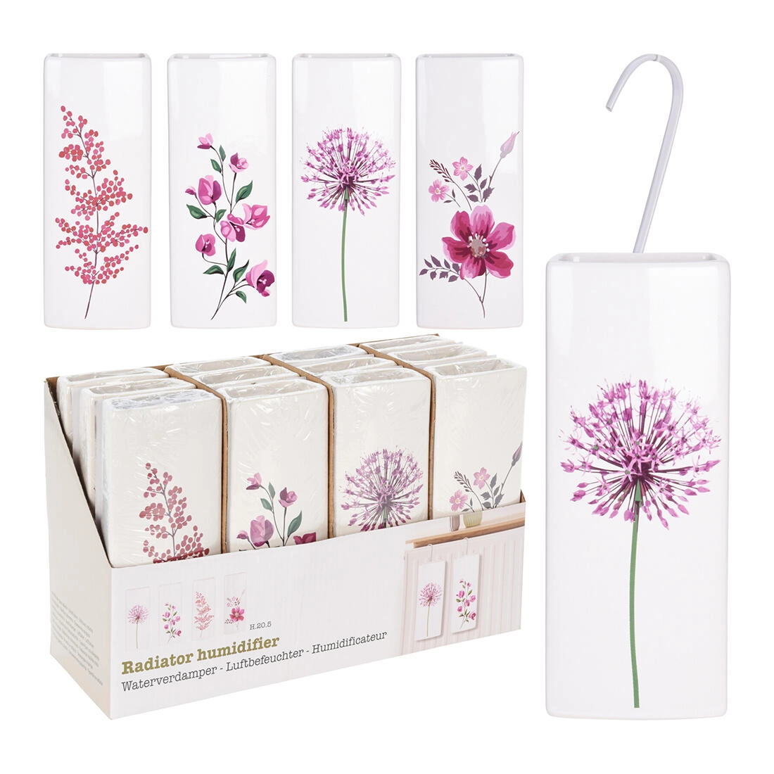 Élégant évaporateur en céramique pour radiateur avec motif de fleurs printanières, il améliore le climat intérieur de votre maison. Il suffit de le remplir d’eau et de l’accrocher – humidification naturelle de l’air sans électricité, fonctionnement silencieux et entretien facile. La surface blanche brillante et les décorations florales discrètes s’intègrent à tout intérieur.