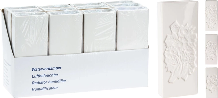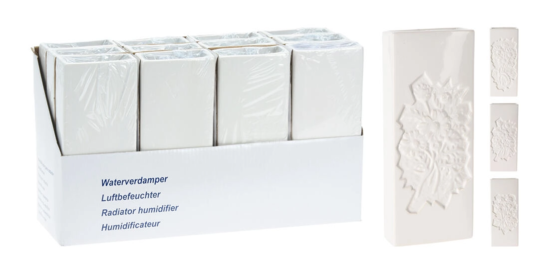 Élégant évaporateur céramique pour radiateur avec relief floral gaufré, il aide à humidifier naturellement l’air dans les pièces sèches. Grâce à son crochet pratique, il se suspend facilement à la plupart des radiateurs. Ses dimensions compactes 20,5 × 8 × 3,5 cm économisent de la place et la couleur blanche s’intègre dans tout intérieur.