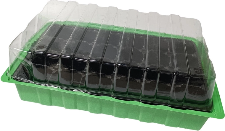 Pratique mini-serre avec plateau de semis noir de 24 alvéoles, idéale pour le prégermage et le démarrage des plantes à partir de graines. Elle comprend un couvercle en plastique transparent qui aide à maintenir un microclimat optimal pour une germination rapide et une croissance saine.