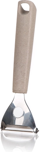 Éplucheur de cuisine pratique avec lame transversale pour un nettoyage rapide des légumes et des fruits. Conception robuste en acier inoxydable, poignée ergonomique confortable en polypropylène avec adjonction de son de blé et œillet de suspension pour un rangement facile. Convient pour carottes, concombres, raifort et autres fruits allongés.