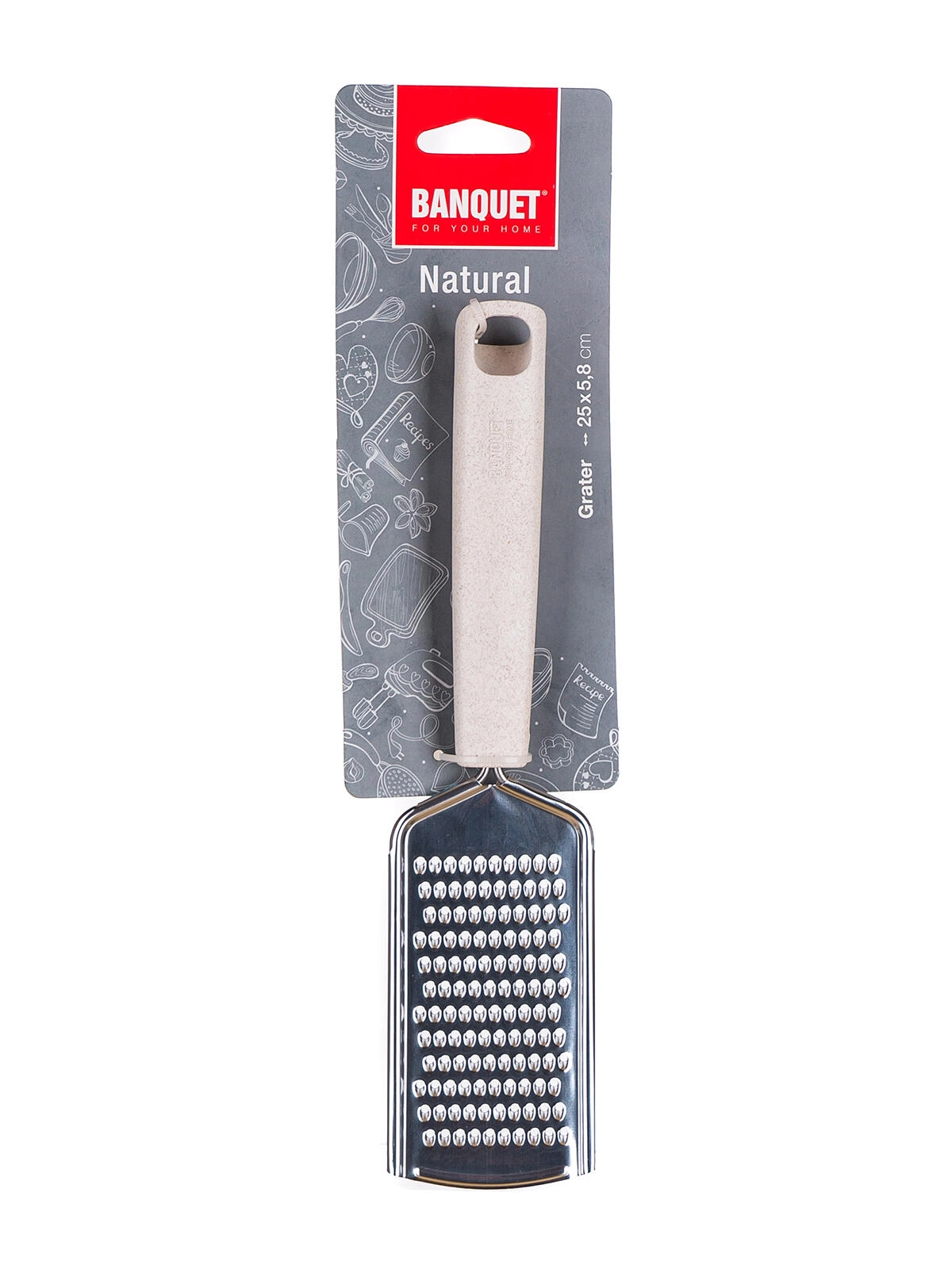 Pratique râpe de cuisine NATURAL en acier inoxydable avec poignée confortable en polypropylène et son de blé, idéale pour un usage quotidien à la maison comme en milieu professionnel. Elle offre un design intemporel, un entretien facile et est compatible lave-vaisselle. Grâce à son œillet de suspension, elle reste toujours à portée de main.