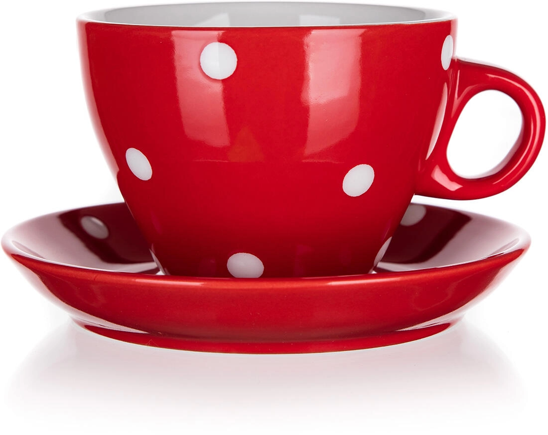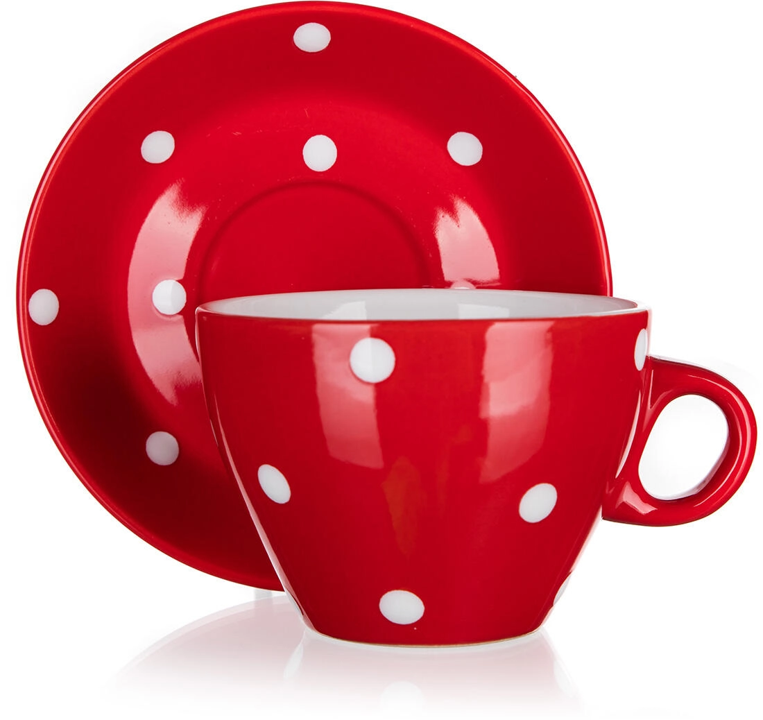 Élégante tasse en céramique avec soucoupe de 290 ml, de couleur rouge à pois blancs, qui apporte une touche ludique à votre table. Fabriquée en céramique de qualité, elle est adaptée au micro-ondes et passe au lave-vaisselle, idéale pour une utilisation quotidienne.