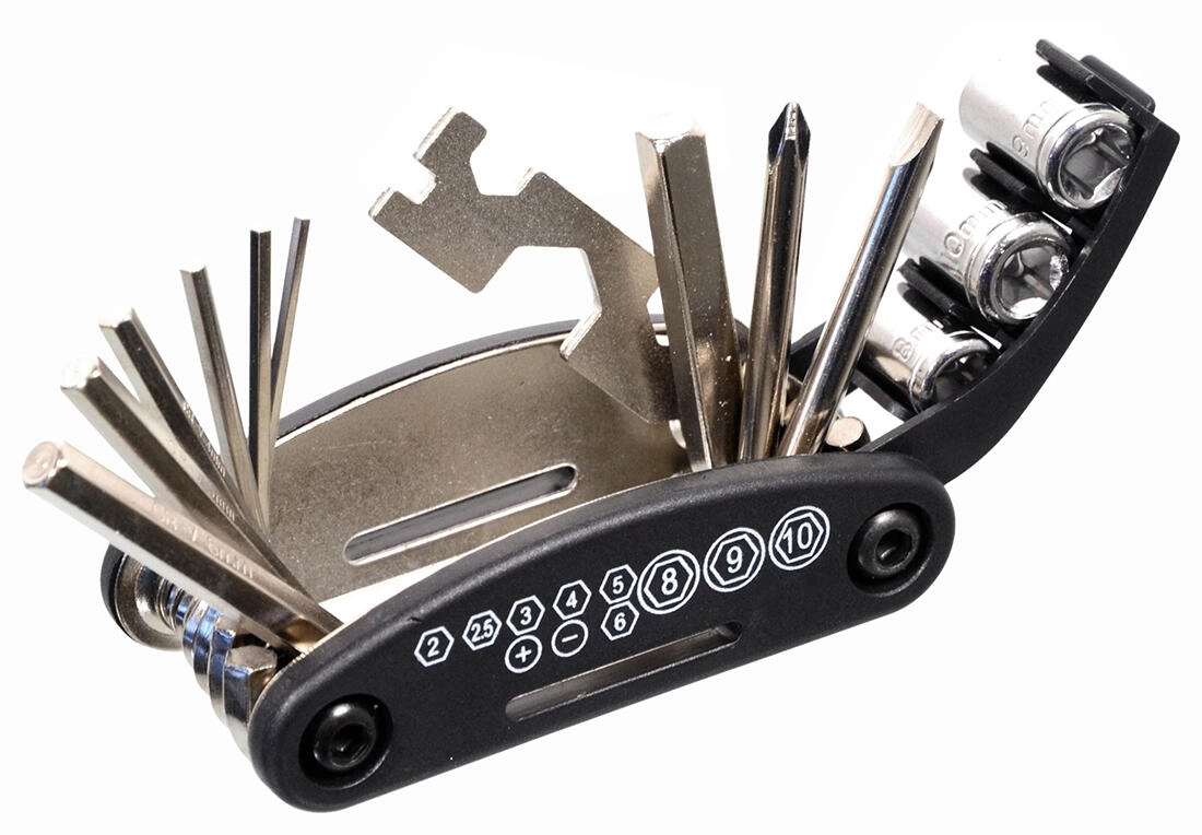 Clés Allen intégrées, tournevis, clés plates et douilles couvrent les réparations et ajustements de vélo les plus courants directement sur le terrain.