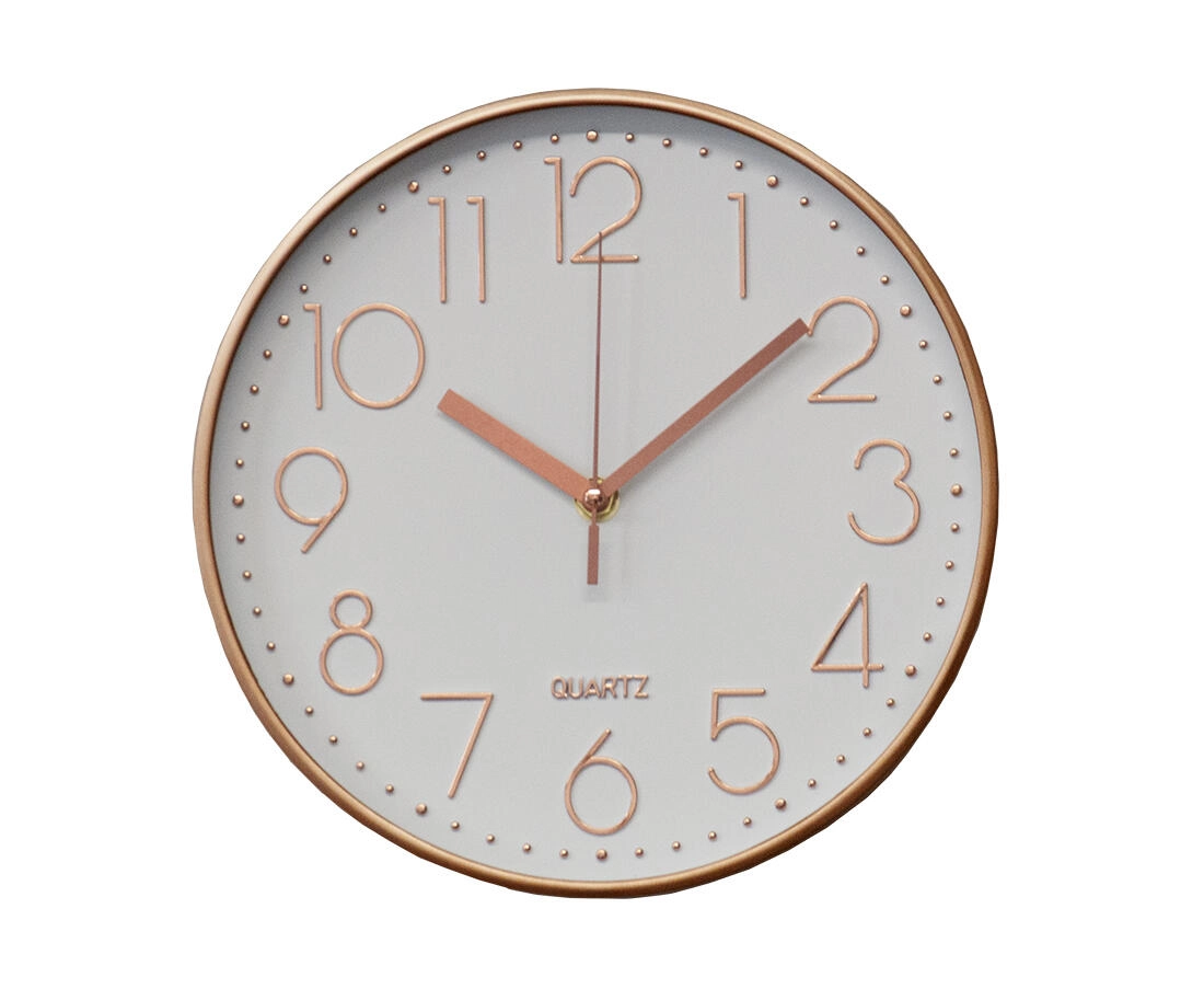 Élégante horloge murale de 25 cm de diamètre avec un cadran 3D et une combinaison de cadre rose doré et de fond blanc, qui réchauffe tout intérieur. Grâce à son mouvement silencieux sans tic-tac prononcé, elle convient au salon, à la chambre comme au bureau. La fabrication de qualité en verre, métal et plastique garantit une longue durée de vie et un look moderne.