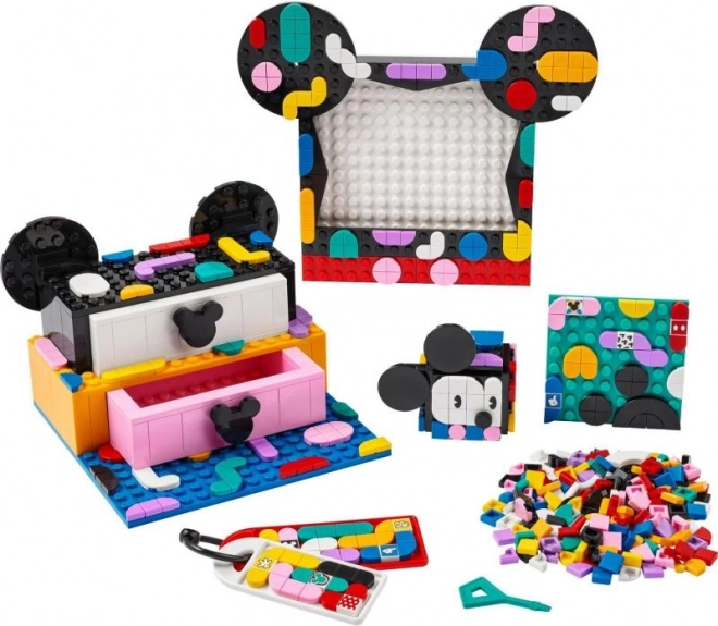- 6 surfaces de création DOTS : 2 tiroirs avec oreilles MICKEY, un cadre photo, un porte‑notes avec compartiment secret, 2 pendentifs plats pour sac, des patchs autocollants