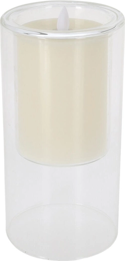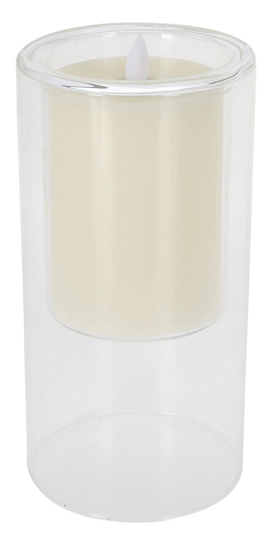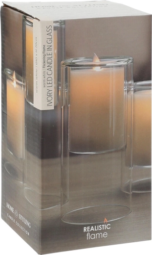 Élégante bougie LED en verre dans la teinte IVORY, offrant un éclairage sûr et chaleureux sans fumée ni cire. Grâce à sa flamme vacillante, elle imite fidèlement un vrai feu et est idéale pour créer une atmosphère relaxante à la maison, sur la table ou dans la chambre.