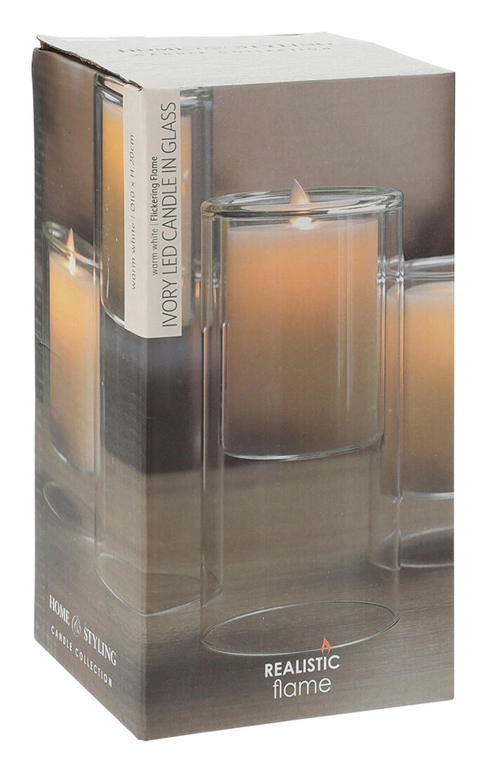Cette bougie LED stylée de 10 cm de diamètre et 20 cm de hauteur est placée dans un solide contenant en verre qui met en valeur son look élégant. La douce teinte ivory est universelle et se marie facilement à tout intérieur.