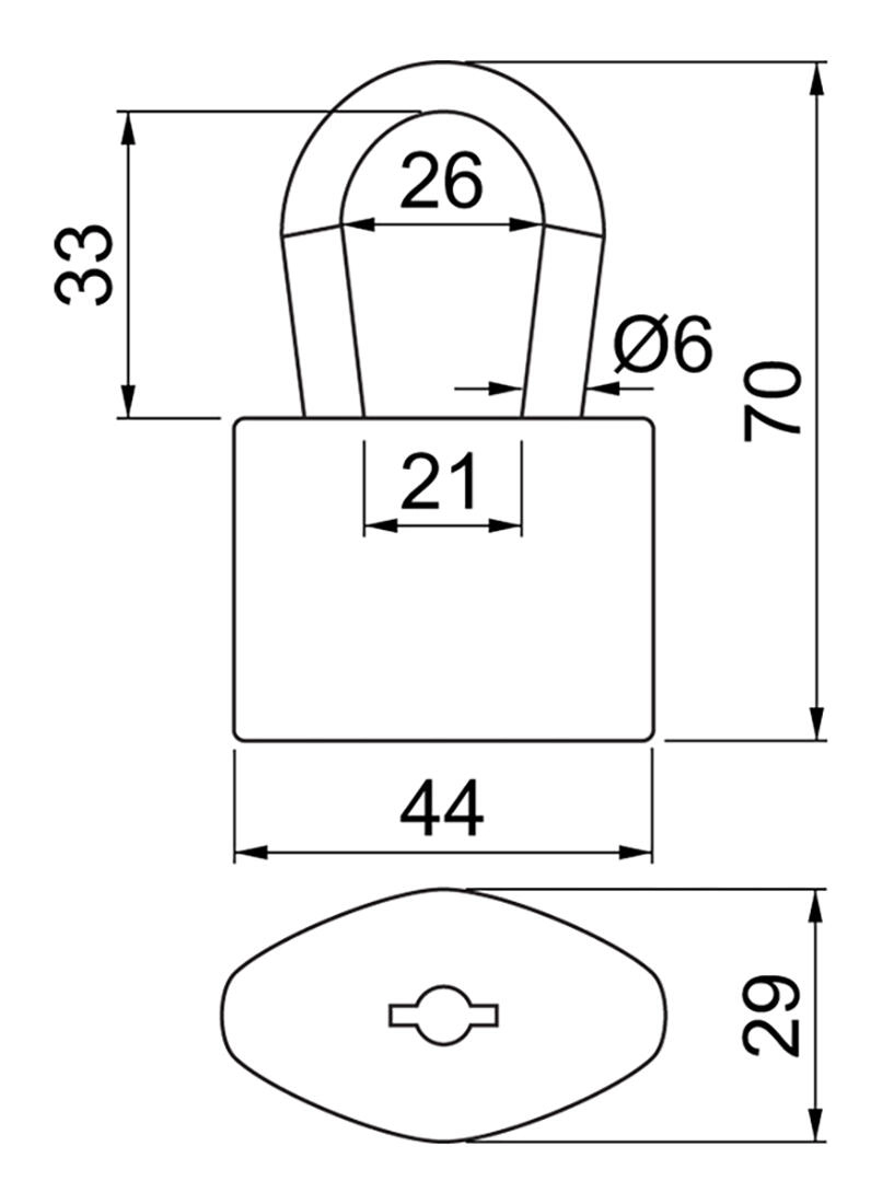 - Largeur du corps 44 mm, diamètre de l’anse 6 mm, clair d’anse 21 × 26 mm, hauteur totale 70 mm