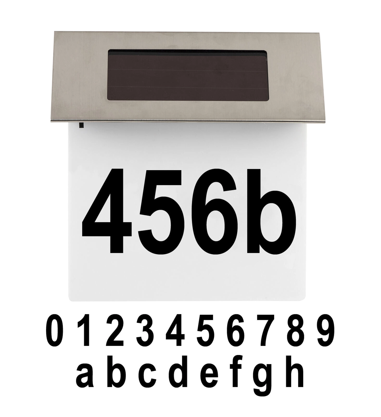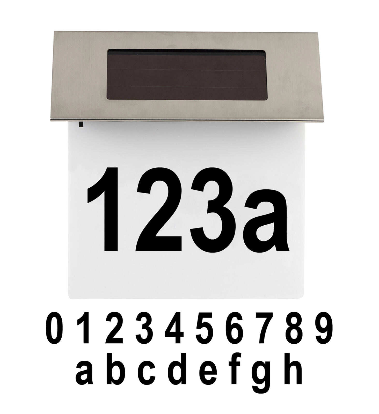 Rendez votre adresse visible de jour comme de nuit. Le luminaire LED solaire pour numéro de maison, avec cache en acier inoxydable et plaque blanche rétroéclairée, offre un éclairage fiable grâce au panneau solaire intégré et à la batterie rechargeable. Sans câbles, avec interrupteur ON/OFF et indice de protection IP44 pour une utilisation toute l’année.