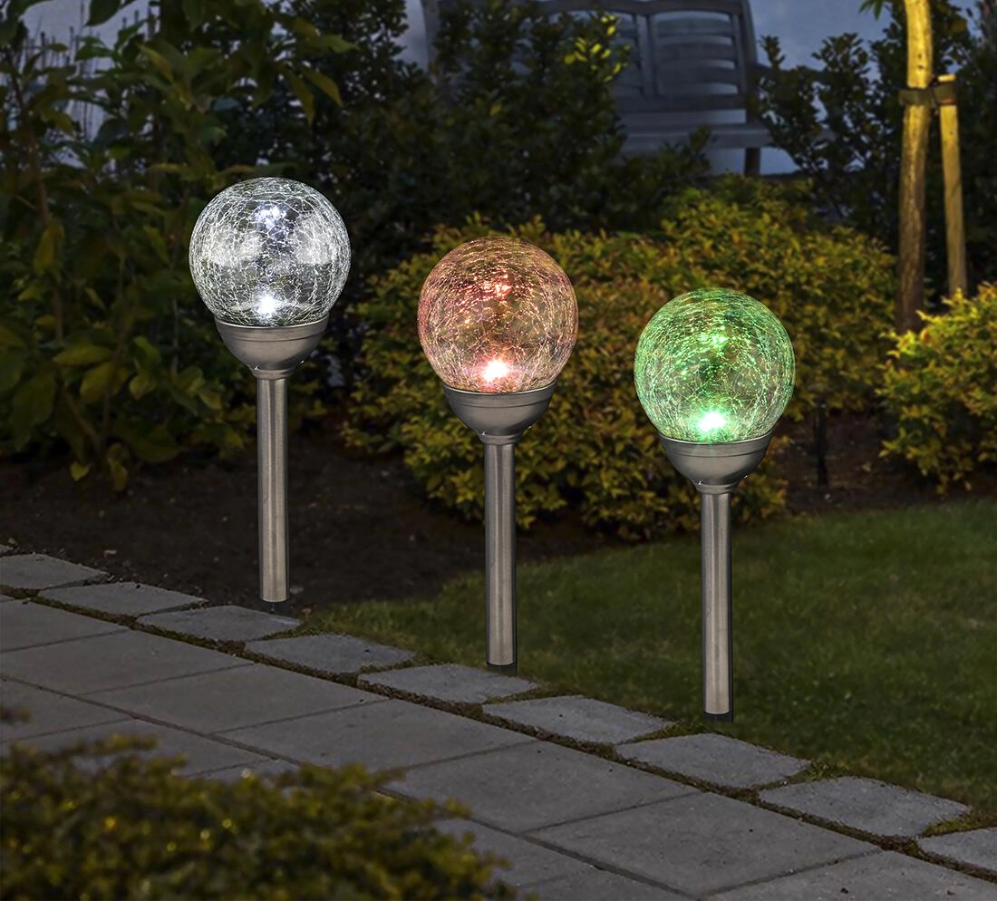 Lampe solaire élégante en forme de sphère, diamètre 12 cm et hauteur 42,5 cm, offrant un éclairage économique sans câbles. Grâce à ses 2 LED claires, elle propose deux modes d’éclairage – blanc froid ou lumière colorée changeante. Conception robuste en acier inoxydable, verre et plastique transparent avec indice de protection IP44, idéale pour les jardins, terrasses et allées.