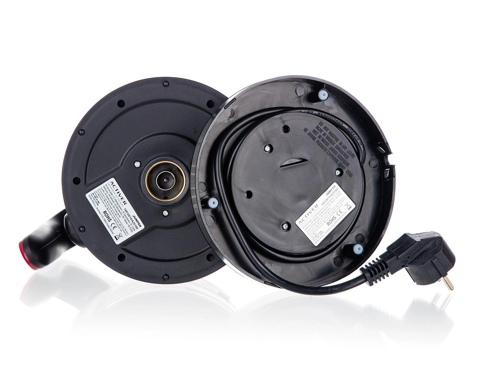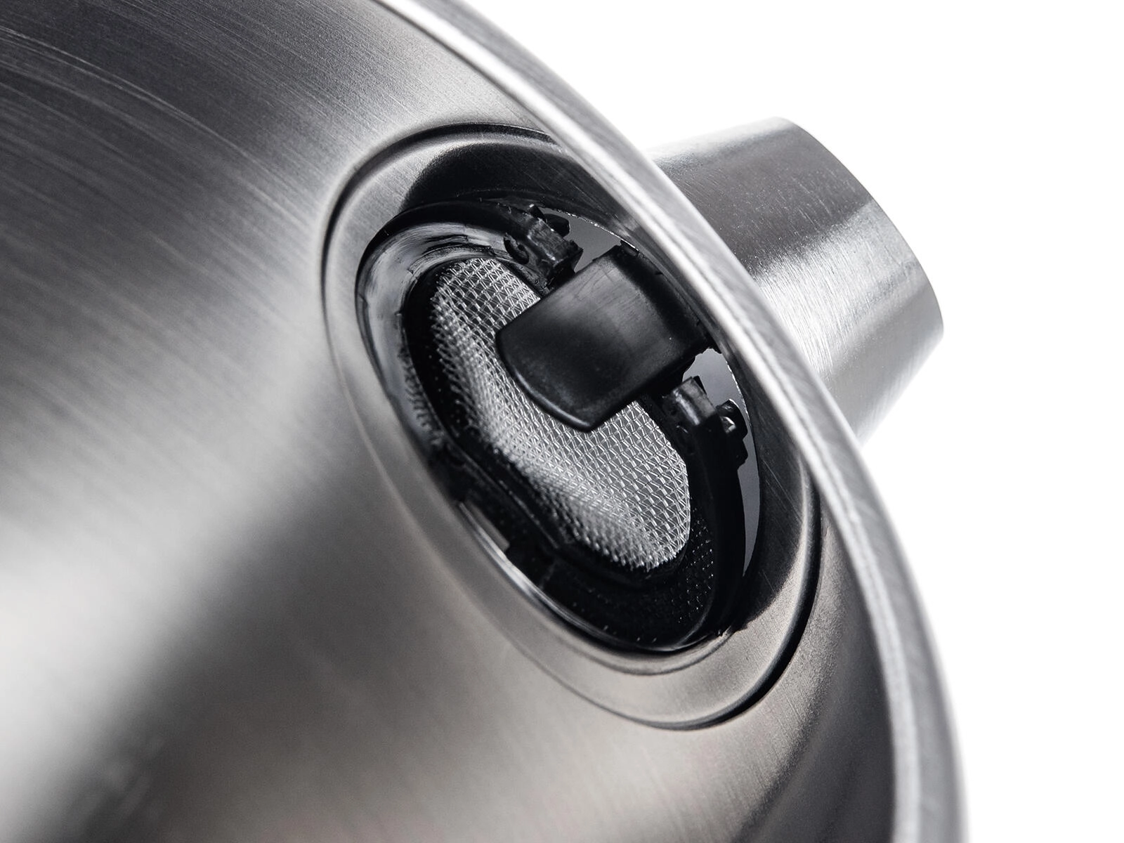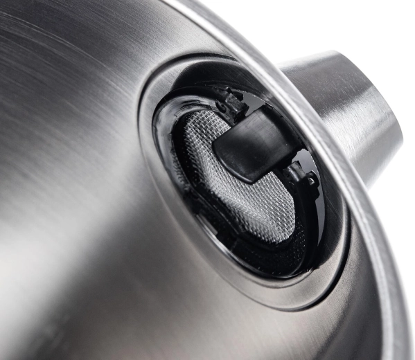 La bouilloire offre une puissance de 1850–2200 W pour une ébullition rapide, possède un fond plat pour un entretien aisé et une base avec connecteur central permettant un enclenchement pratique à 360° depuis n’importe quel angle. L’arrêt automatique et manuel ainsi que la protection contre la surchauffe renforcent la sécurité au quotidien. Le filtre intégré retient les grosses impuretés et facilite un versement propre, sans dépôts.