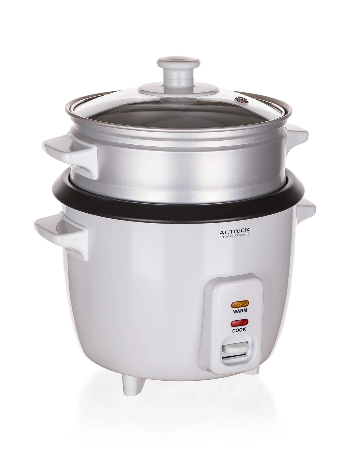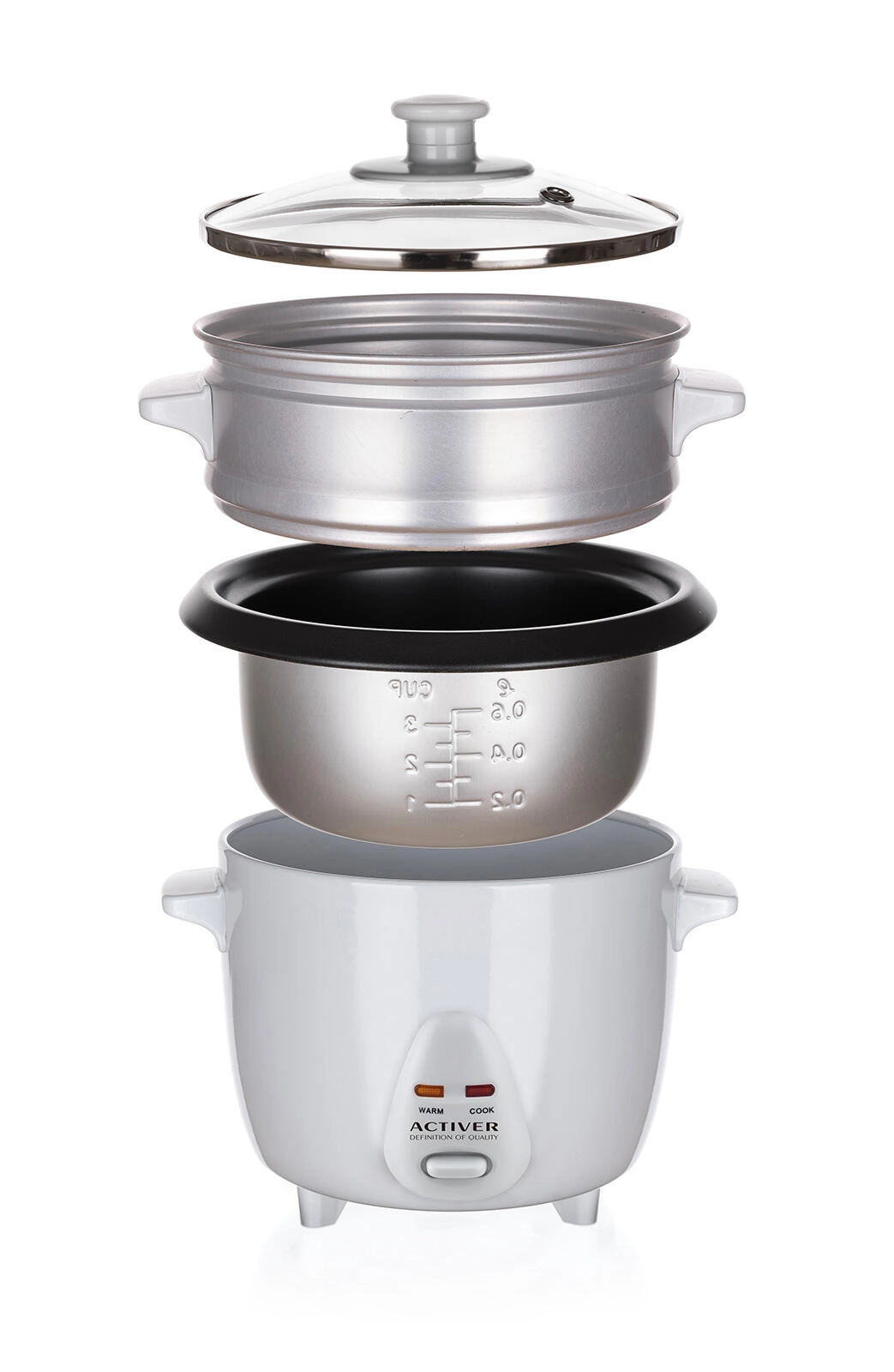 L’emballage comprend un panier vapeur pour une préparation saine des légumes ou du poisson, un gobelet doseur pour un dosage précis et une spatule pour un service facile. La cuve intérieure antiadhésive garantit que le riz n’attache pas et que le nettoyage se fait en un instant. Le couvercle en verre avec valve vapeur permet de surveiller la cuisson, tandis que les voyants lumineux et les pieds antidérapants augmentent la sécurité et le confort.