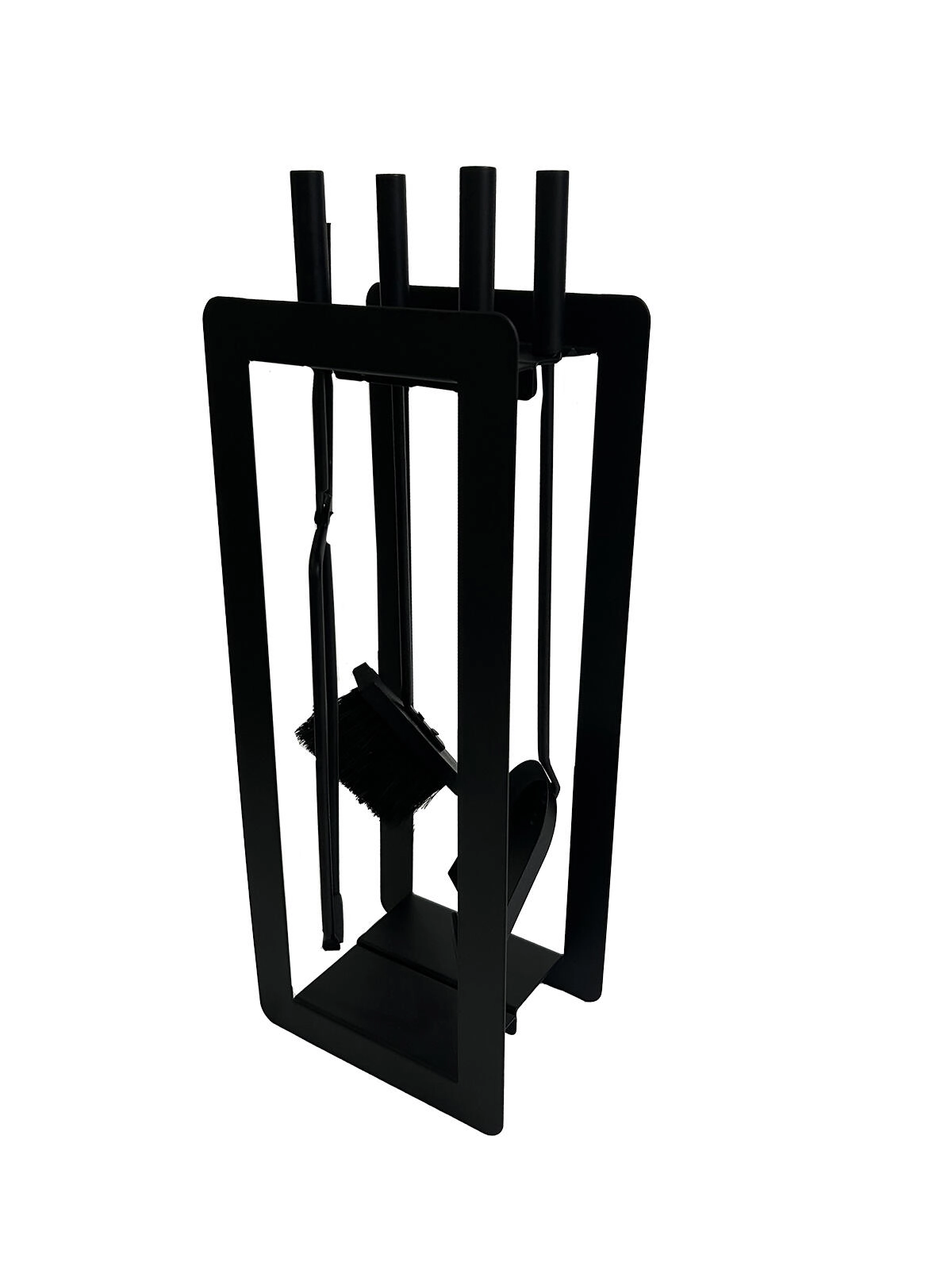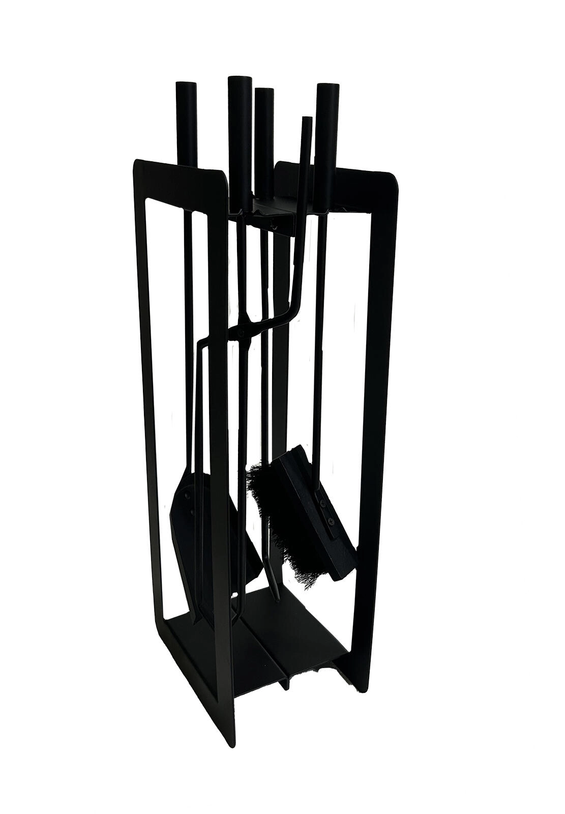 Le support métallique ouvert garde les outils à portée de main et maintient l’espace autour de la cheminée propre et ordonné.