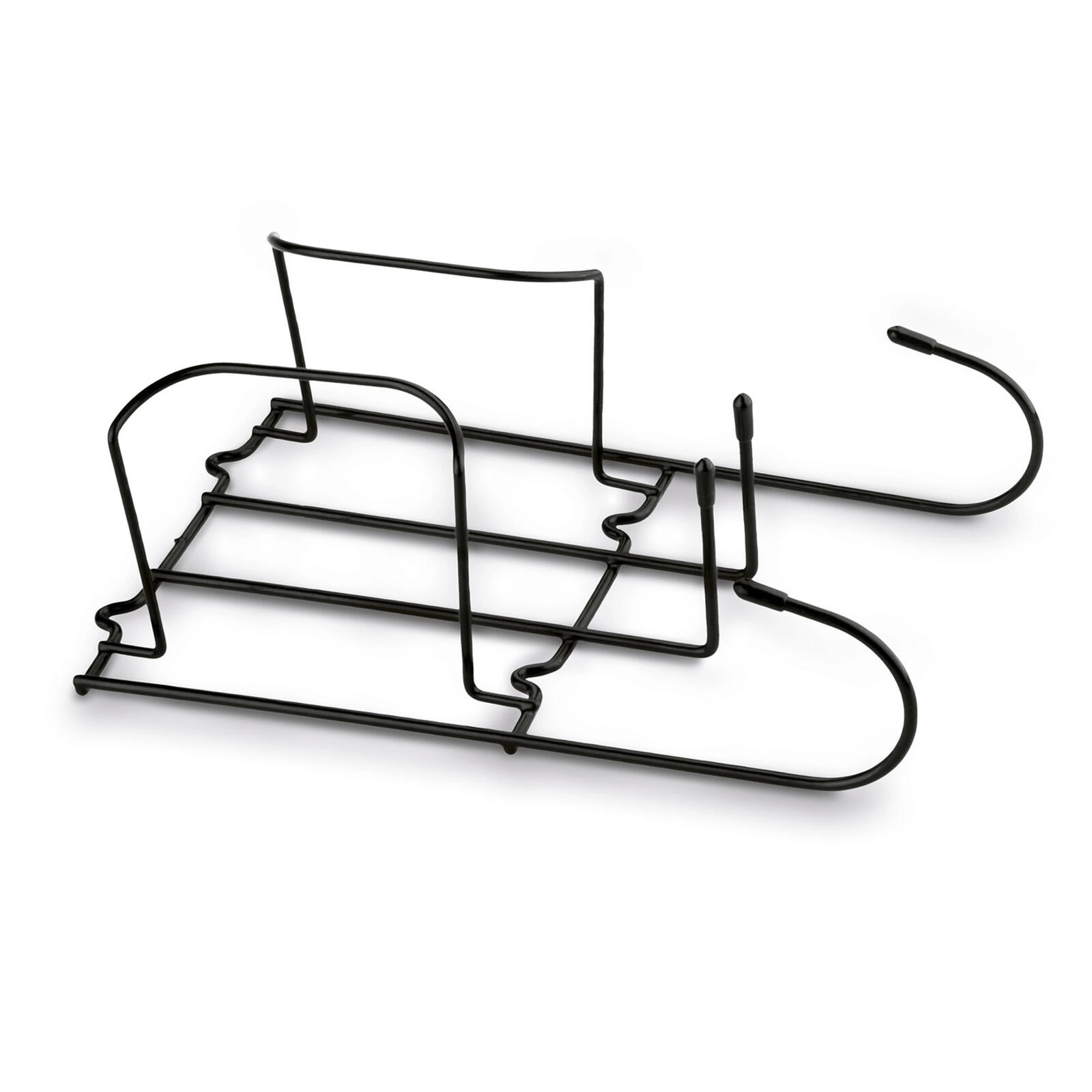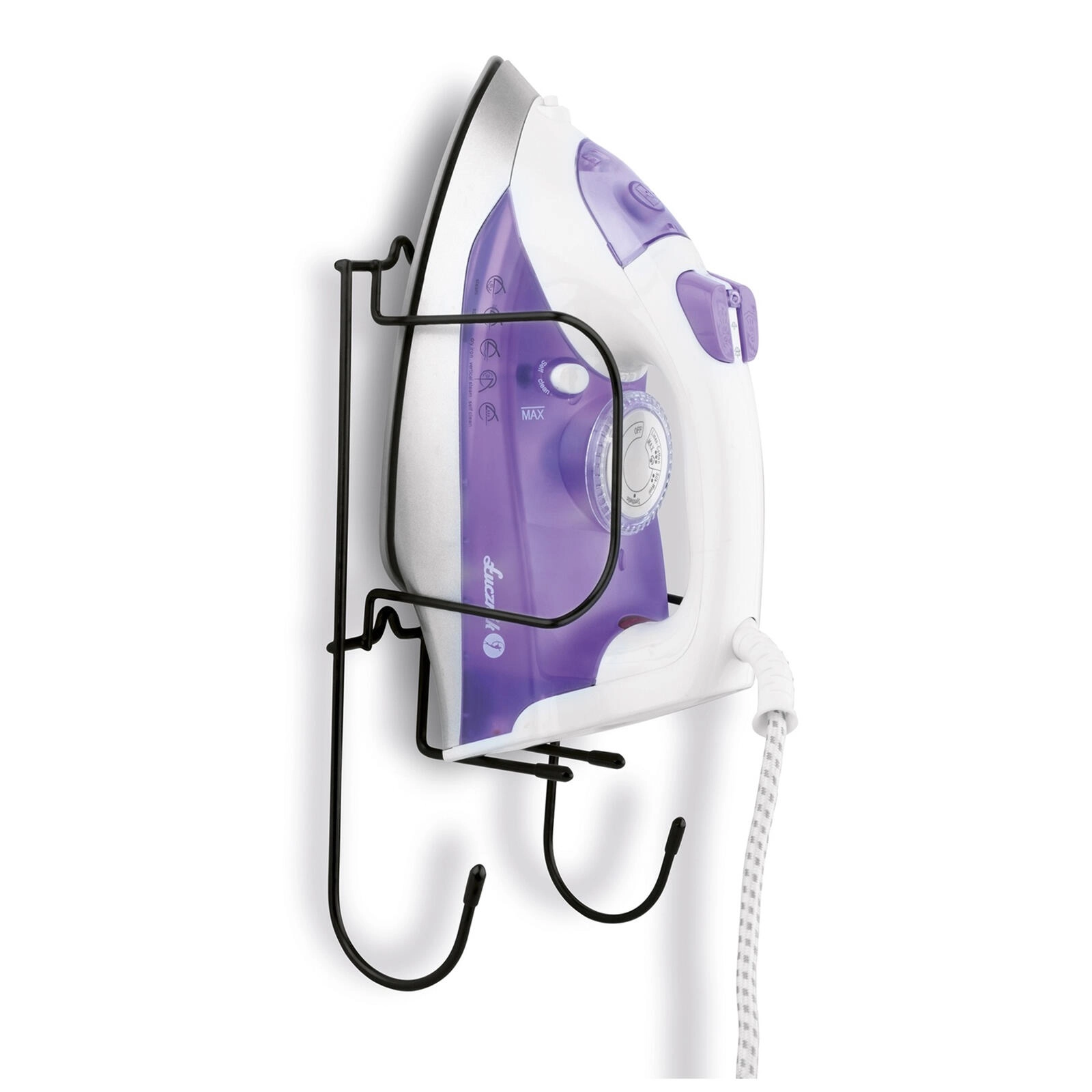Le support supérieur maintient fermement le fer, tandis que les crochets inférieurs permettent de suspendre la planche à repasser ou d’enrouler le câble pour un rangement optimal.