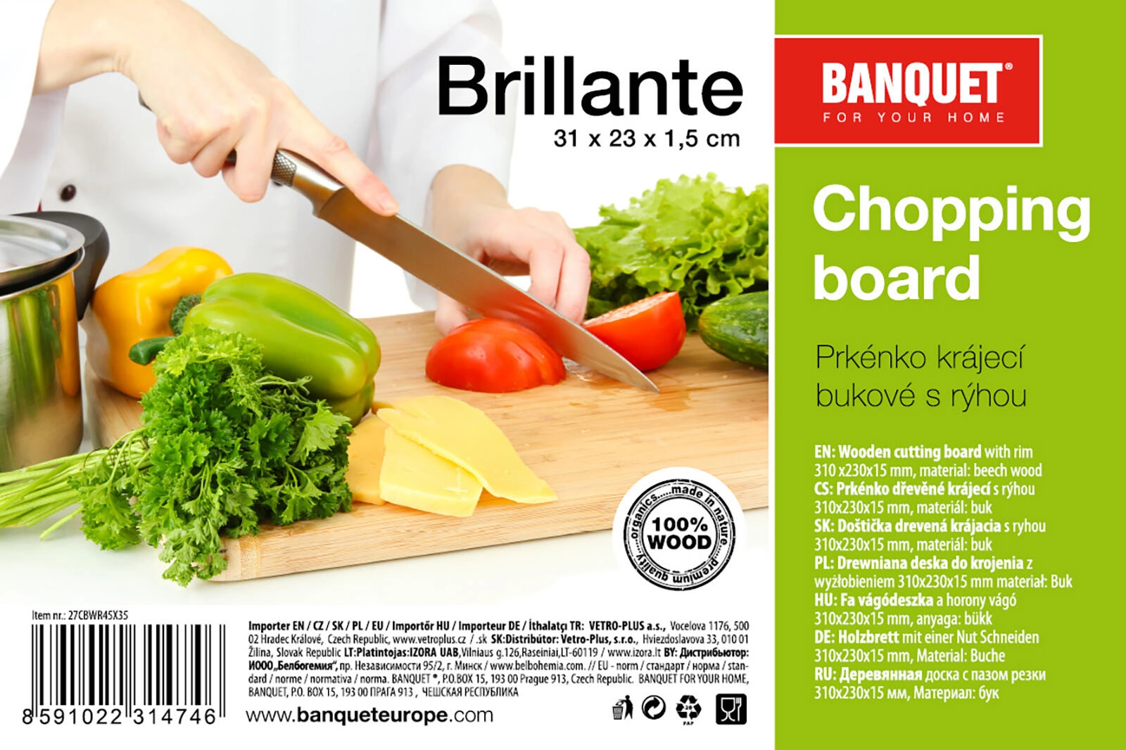 Pratique planche à découper en bois BRILLANTE de 31 × 23 cm avec une rainure périphérique pour recueillir les jus. Elle offre un bois de hêtre de qualité, une finition naturelle et une conception durable pour un usage quotidien.