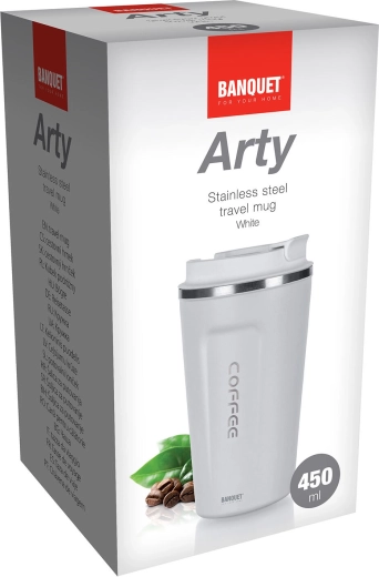 Mug isotherme de voyage Arty à double paroi de 450 ml qui garde vos boissons chaudes ou froides plus longtemps grâce au corps sous vide. Conception robuste en acier inoxydable 201/304, dimensions confortables pour la prise en main et la plupart des porte-gobelets de voiture, et couvercle pratique pour un usage quotidien. Idéal pour le travail, la voiture et les déplacements.
