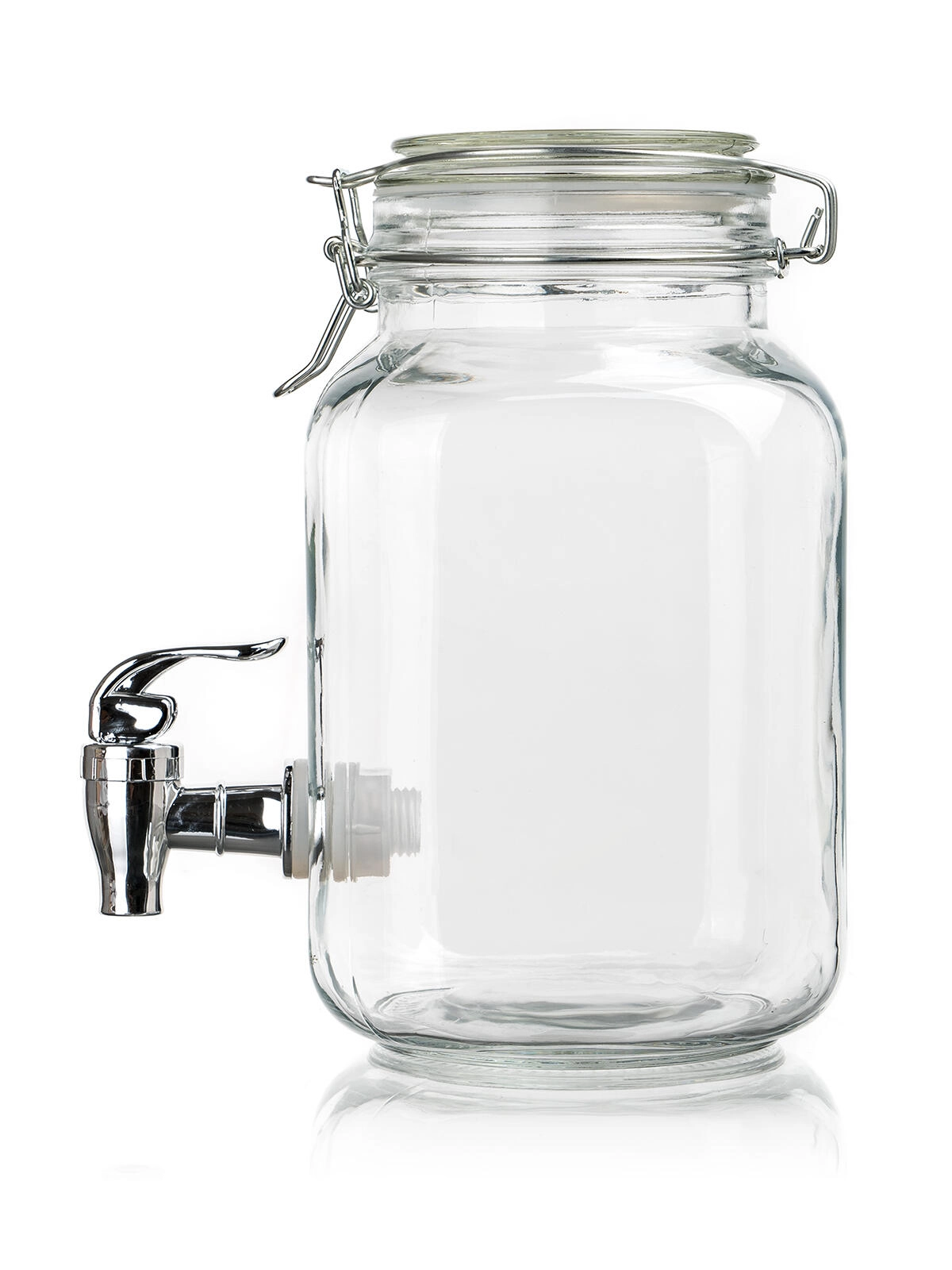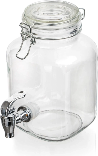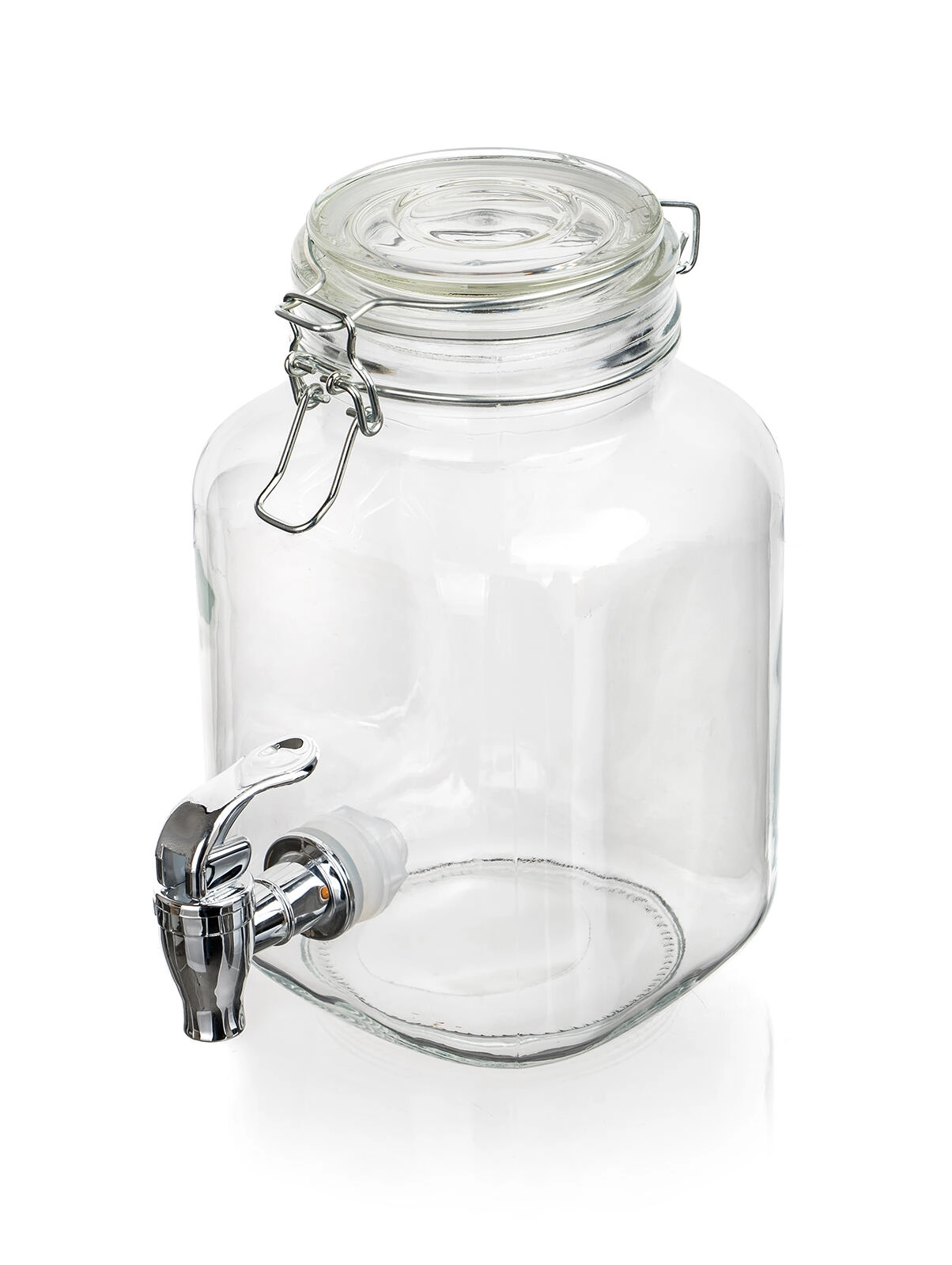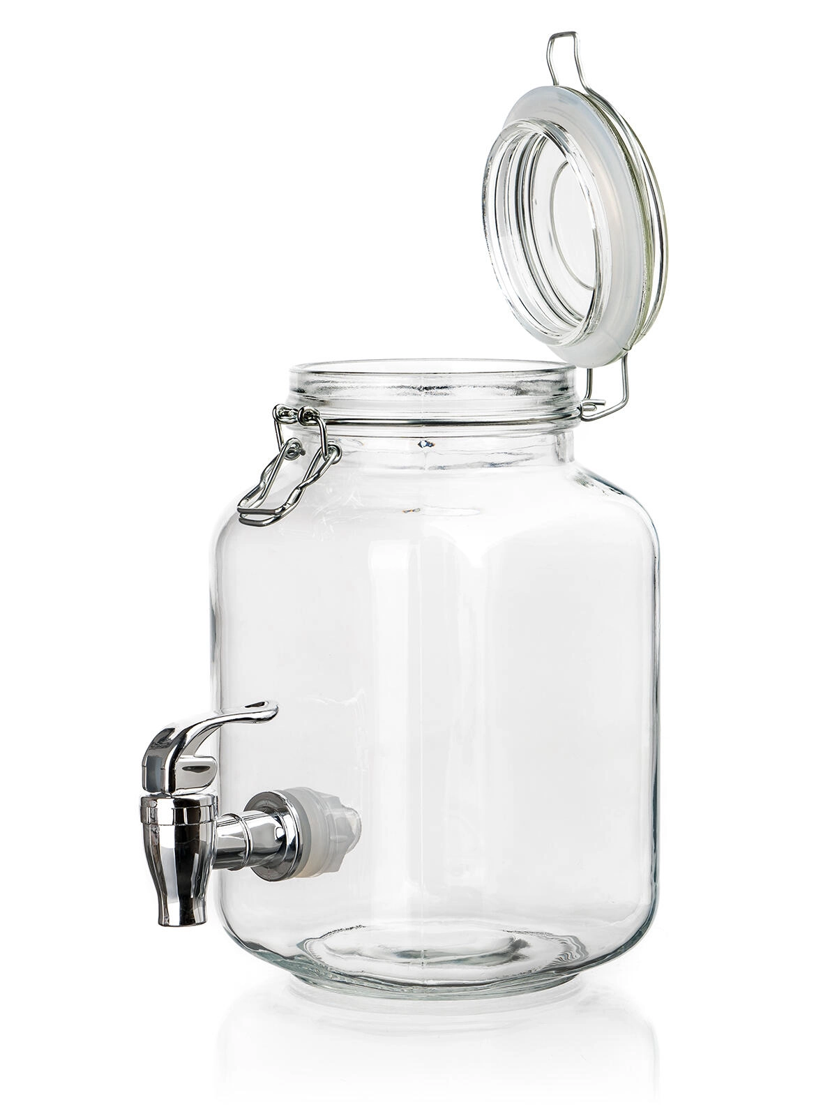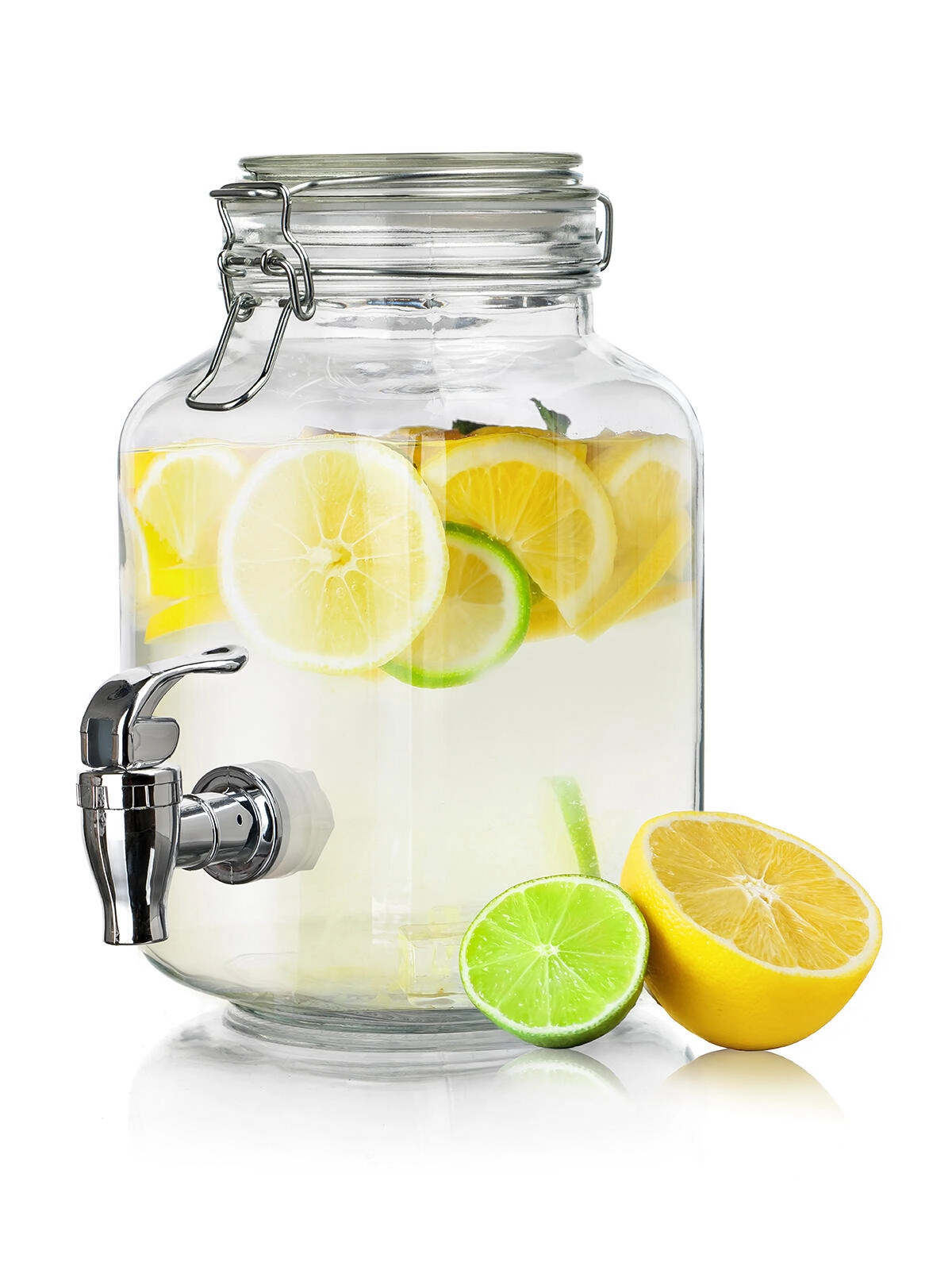 Élégant distributeur de boissons en verre d’une capacité de 2,2 l, idéal pour servir des limonades maison, des jus et des thés glacés. Grâce au couvercle à levier avec joint, les boissons restent fraîches plus longtemps et le robinet métallique assure un service pratique et propre. Son large goulot facilite le remplissage, l’ajout de glace et de morceaux de fruits – un choix parfait pour les fêtes, les garden-parties et la fraîcheur du quotidien.