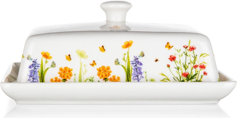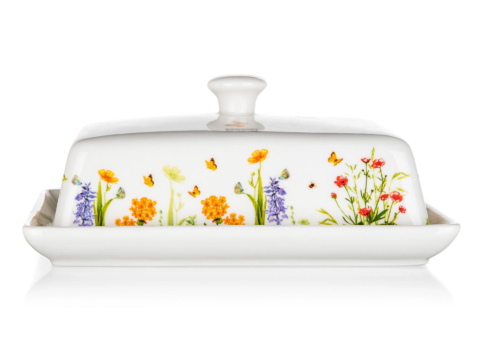 Le beurrier stylé Meadow allie fonctionnalité et design. La céramique robuste avec émail lisse se nettoie aisément, le couvercle avec poignée permet un levage et un transport confortables. Le décor de fleurs et de papillons apporte à votre cuisine une touche fraîche de nature.