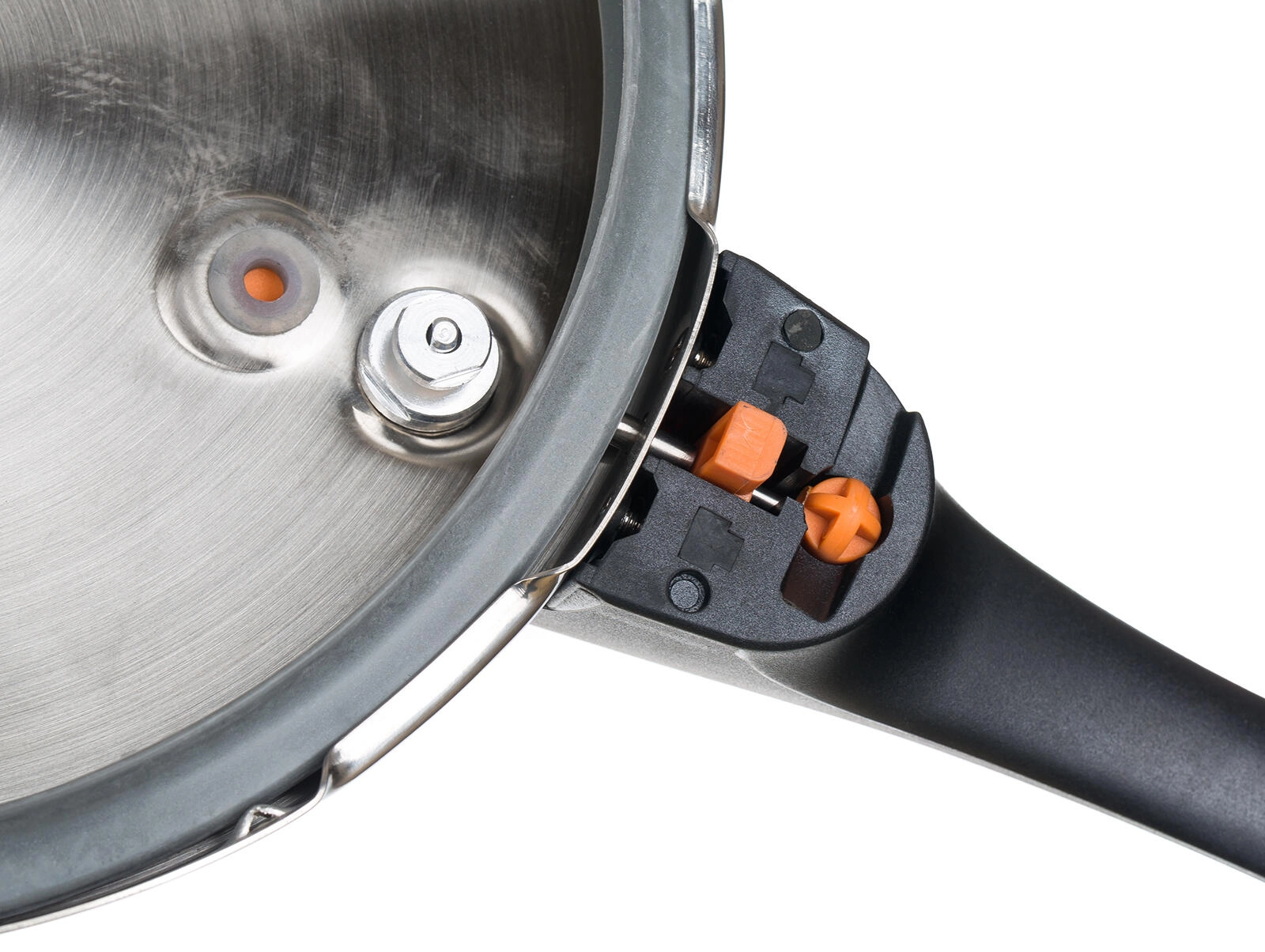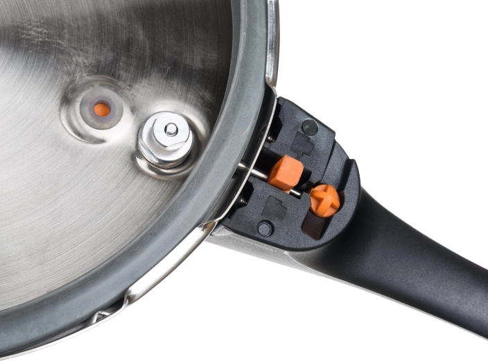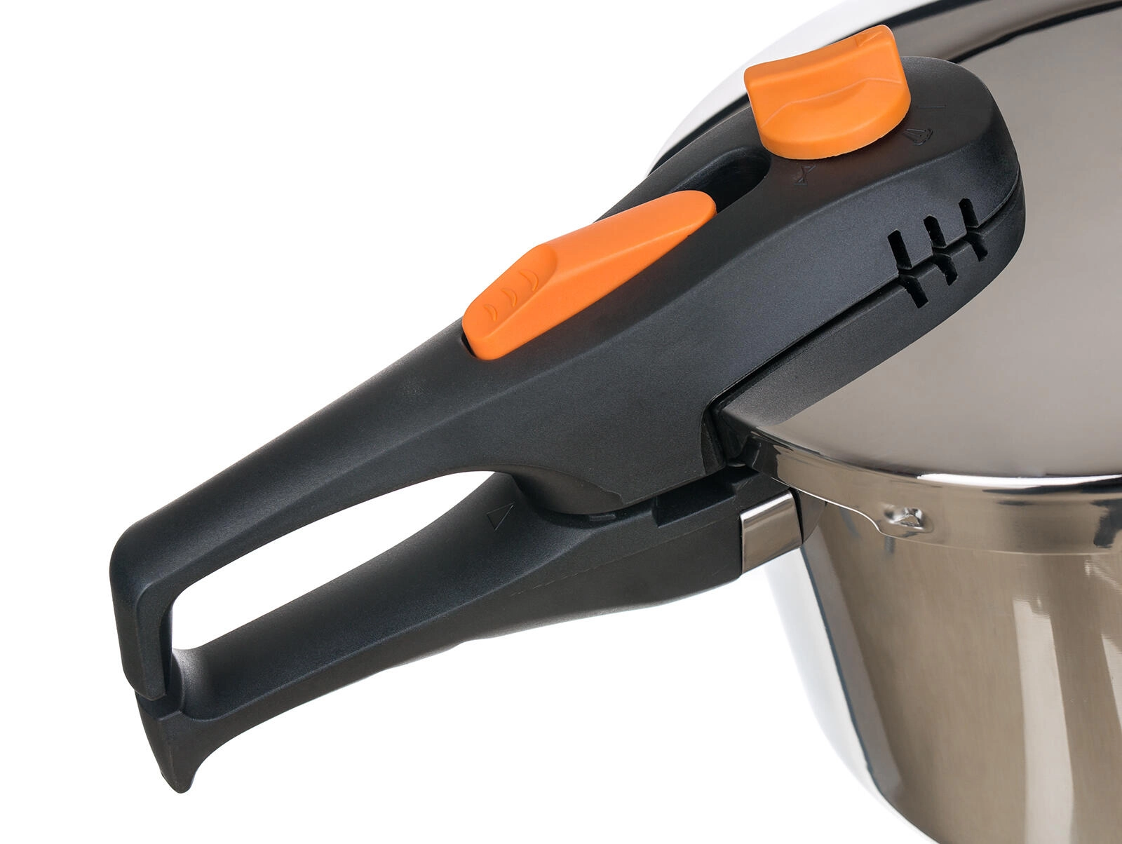 Le couvercle avec valve de travail, sécurité anti-ouverture et commande ergonomique orange permet un verrouillage fiable et une évacuation de vapeur confortable.