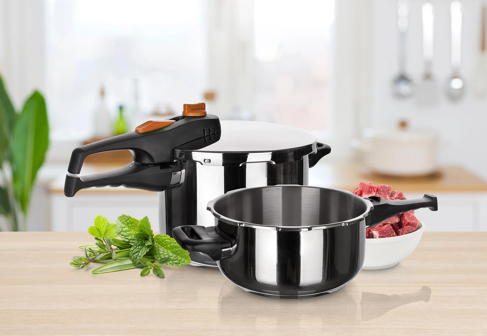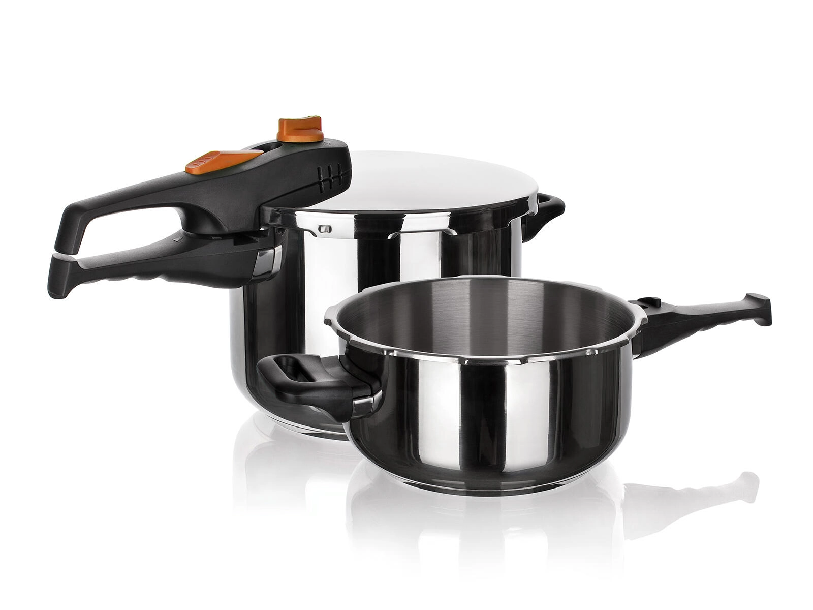 L’ensemble d’autocuiseurs ADAGIO combine l’acier inoxydable 18/8 durable, des éléments de sécurité bien pensés et une commande pratique avec bouton orange. Les deux volumes universels 4 l et 6 l couvrent la cuisson rapide des soupes, bouillons, légumineuses ainsi que la préparation douce des viandes et des légumes. Le fond sandwich robuste de 5 mm apporte stabilité et excellente transmission de chaleur sur gaz, vitrocéramique, électricité et induction.
