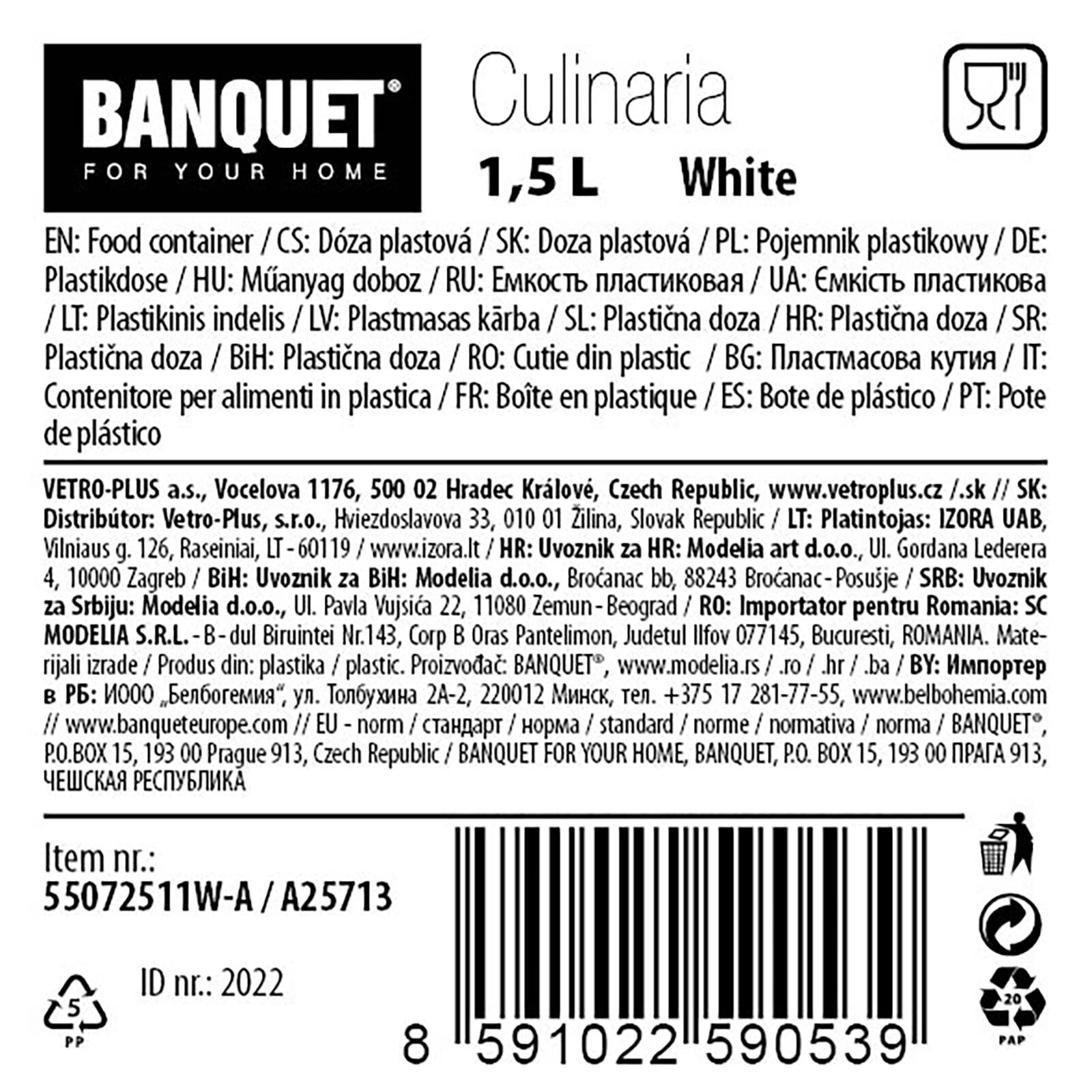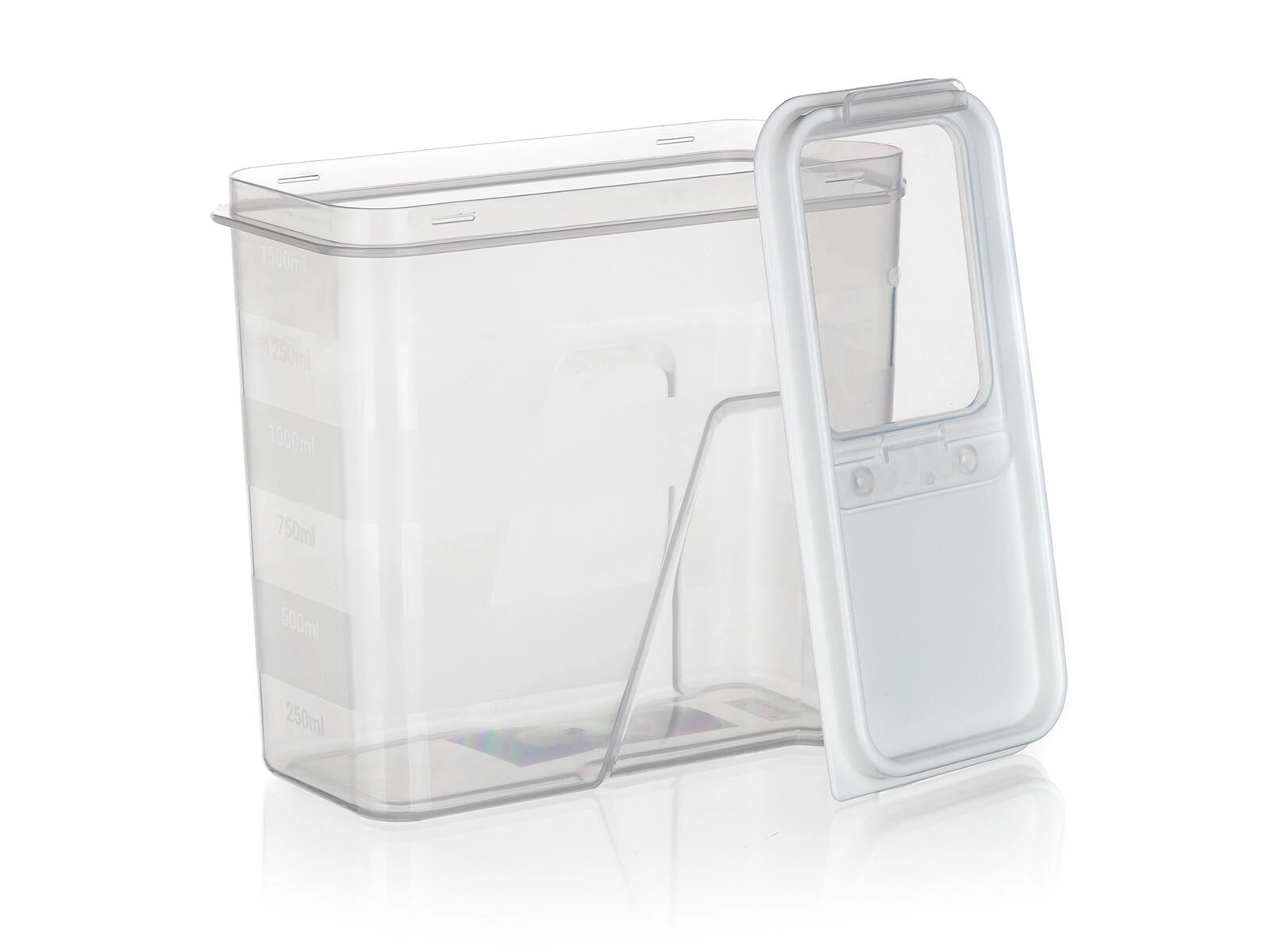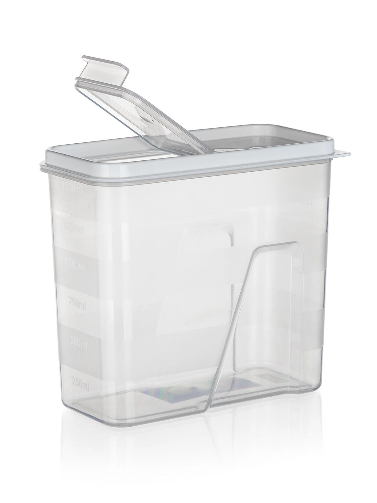 Cette boîte en plastique transparente de 1,5 l de la gamme BANQUET Culinaria est un excellent choix pour organiser votre garde-manger. Le couvercle à ouverture avec bec doseur permet un versement pratique et un portionnage précis. Grâce aux graduations lisibles tous les 250 ml, vous gardez toujours la quantité d’ingrédients sous contrôle.