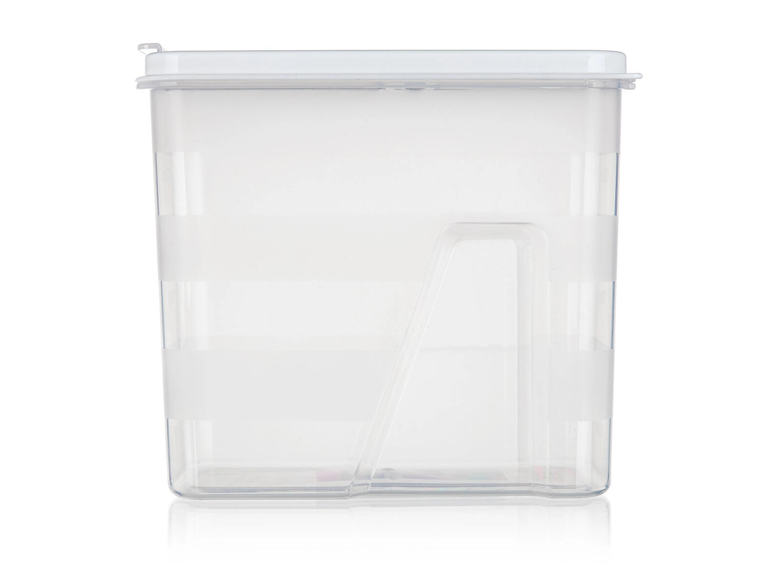La boîte convient au stockage des aliments secs tels que pâtes, riz, légumineuses, farine, sucre et autres ingrédients en vrac. Les parois transparentes assurent un aperçu immédiat du contenu et de la quantité restante, tandis que le couvercle hermétique robuste aide à protéger de l’humidité et des odeurs indésirables. Grâce au couvercle plat, les boîtes se superposent facilement et économisent de la place.