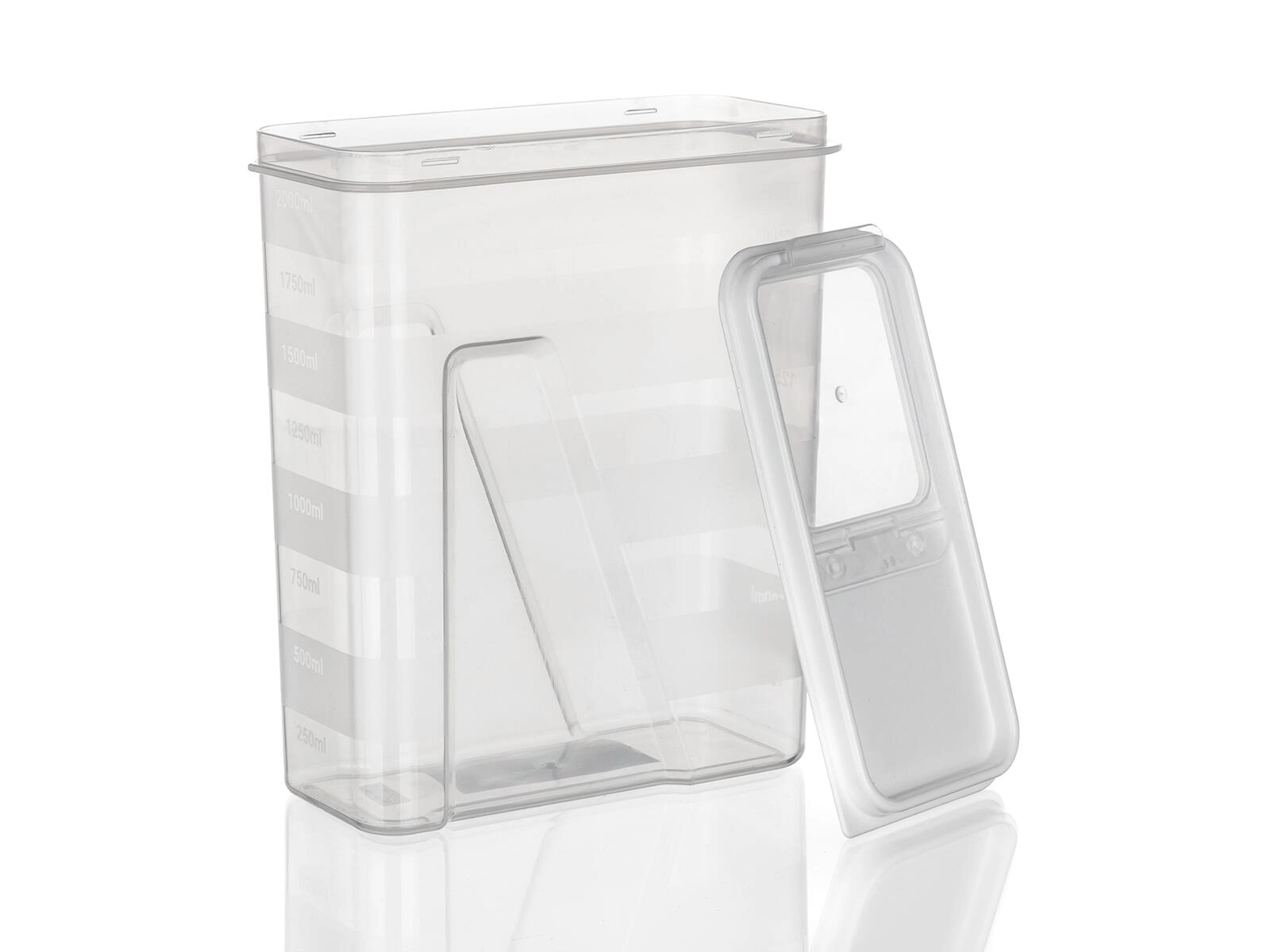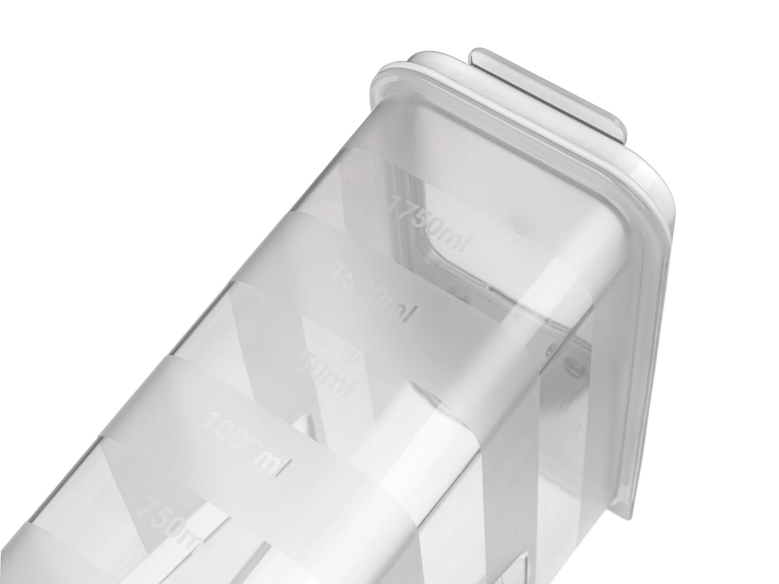 Les graduations intégrées par pas de 250 ml facilitent un dosage précis et le suivi des réserves. La boîte convient au stockage des pâtes, légumineuses, riz, farine, sucre et autres denrées sèches. Grâce à sa forme rectangulaire compacte, elle s’intègre bien dans les étagères et se combine facilement avec d’autres organiseurs.