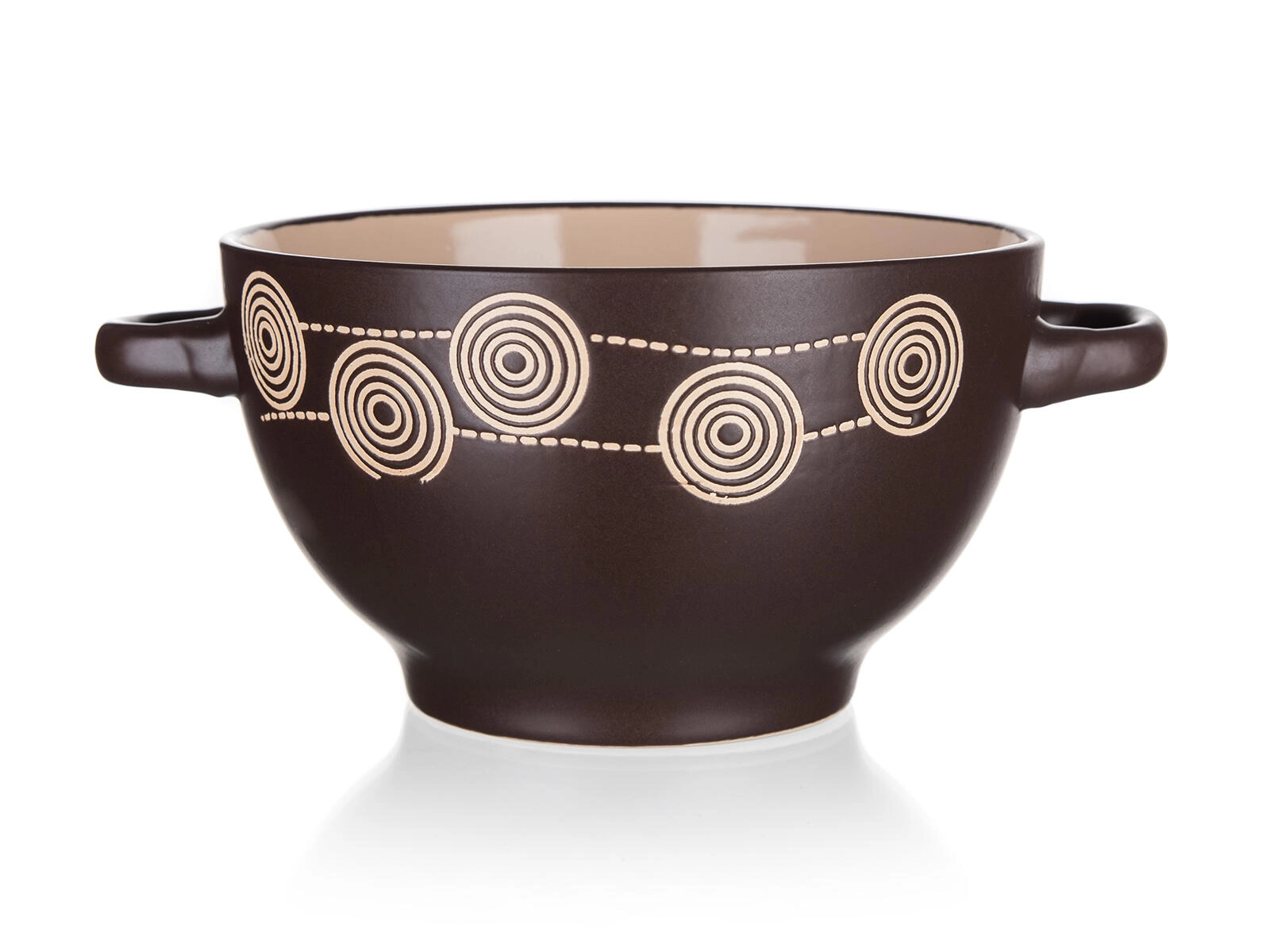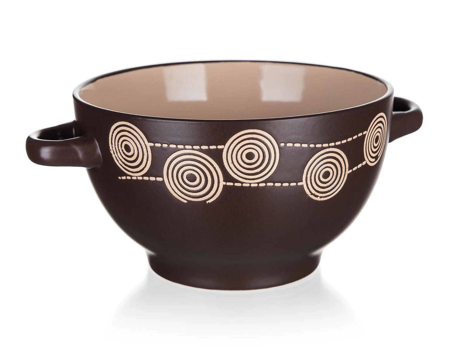 Un bol en céramique élégant avec anses et décor Spirale, en brun foncé, idéal pour servir des soupes, céréales ou pâtes. Il offre une capacité de 660 ml, est résistant et facile à entretenir – peut être utilisé au four à micro-ondes et lavé au lave-vaisselle. Son diamètre pratique de 13,5 cm et ses anses confortables assurent un transport facile et un confort au quotidien.