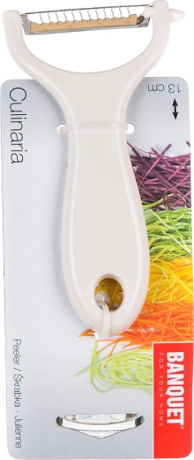 Éplucheur pratique de type Y pour une préparation rapide de fins bâtonnets julienne de légumes et de fruits. La lame en acier inoxydable de 5 cm coupe avec précision et fluidité, le manche en plastique résistant assure une prise en main confortable. Idéal pour carotte, céleri, radis et autres ingrédients, en assortiment de couleurs pour votre cuisine.